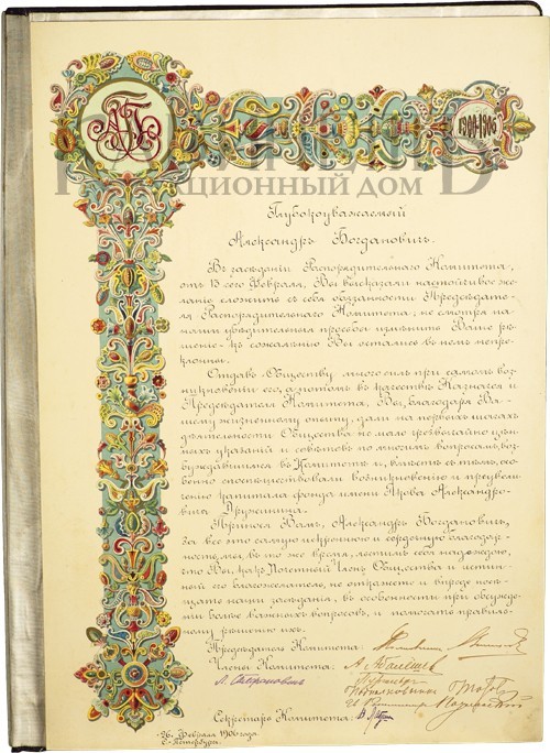 3. Адрес – бумага, цветная печать, ручная раскраска вензеля акварелью, автографы членов