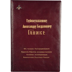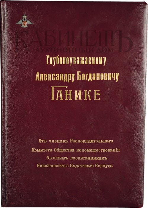 Папка с благодарственным обращением Александру Петровичу Ганике от членов Распорядительного комитета Общества вспомоществования бывшим воспитанникам Николаевского Кадетского Корпуса. Санкт-Петербург, 1906 г.