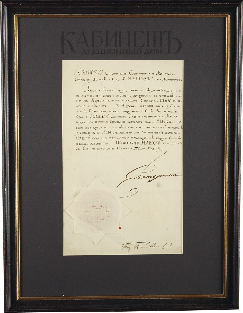 Грамота о пожаловании статскому советнику и члену Императорской конторы строения домов и садов Микулину знака ордена Святого Владимира 3-й степени с собственноручной подписью Императрицы Екатерины II.