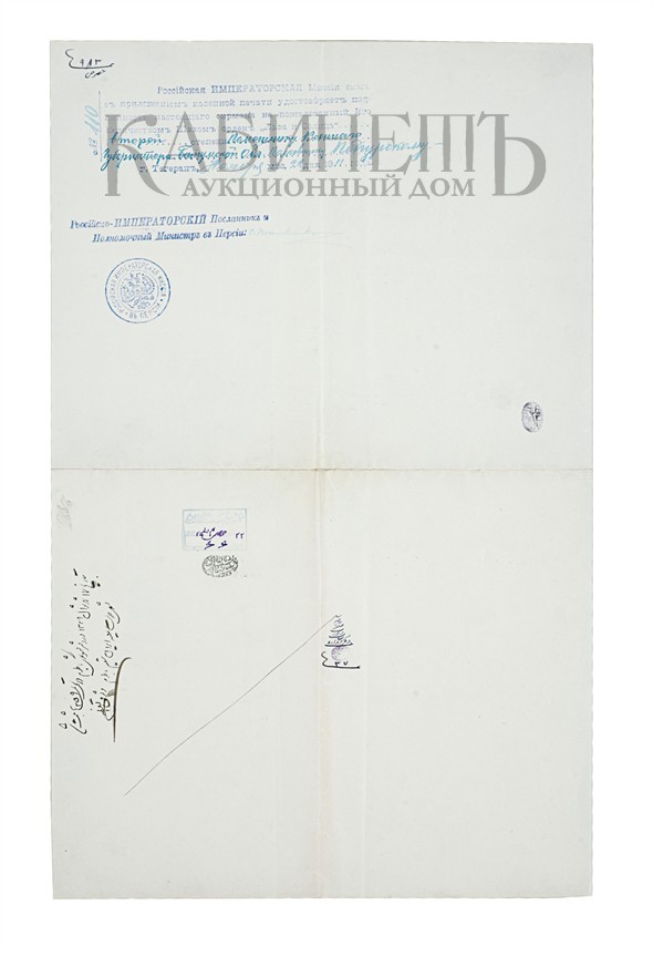 На вкладыше присутствует удостоверяющая печать Российского Императорского Посланника и Полномочного Министра в Персии и личная подпись Станислава Альфонсовича Поклевского- Козелл (1868–1939).