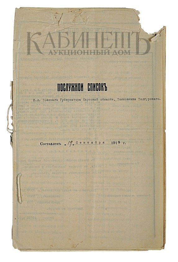 9. 3. Послужной список исполняющего должность Военного Губернатора Карской области полковника А.Д.Подгурскаго от 19 сентября 1915 г.