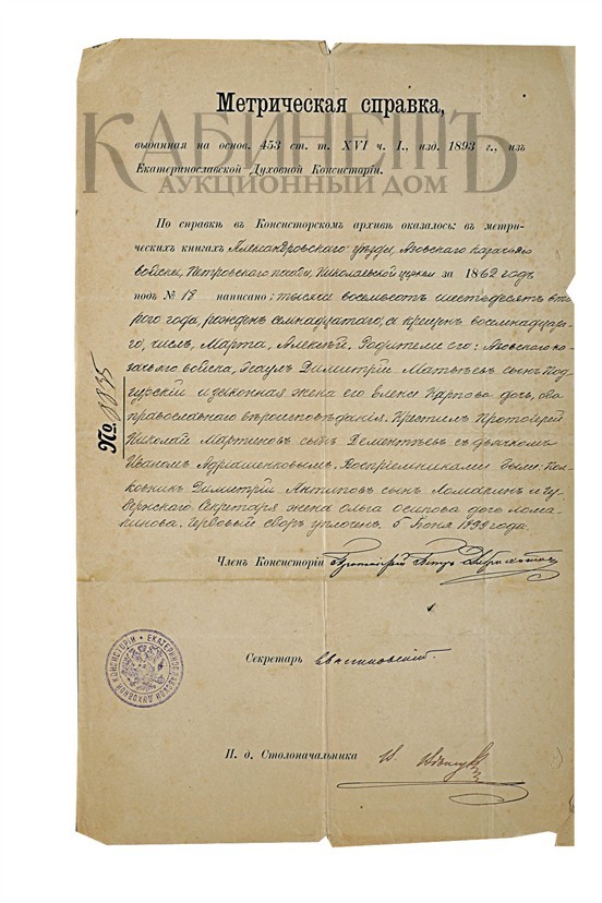 Бумага, печать, орешковые чернила, оттиск печати Екатеринославской Духовной Консистории.