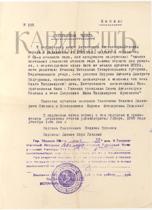 9.1. Метрическая справка № 8835 о рождении и крещении Алексея Дмитриевича Подгурского Бланк.