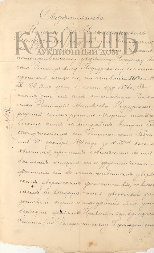 9. 2. Свидетельство № 16 о подтверждении пожалования потомственного дворянства потомственному дворянину поручику Алексею Дмитриевичу Подгурскому, его отцу отставному полковнику Дмитрию Матвеевичу Подгурскому и другим членам его семьи.