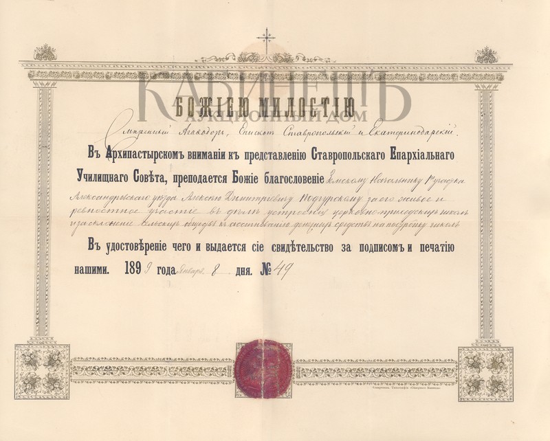 На обороте надпись: «На добрую память Достоуважаемому нашему земскому начальнику 1-го участка Александровского уъзда Ставропольской губернiи Алексъю Дмитрiевичу Подгурскому. 21 февраля 1899 г. Село Воронцово-Александровское».