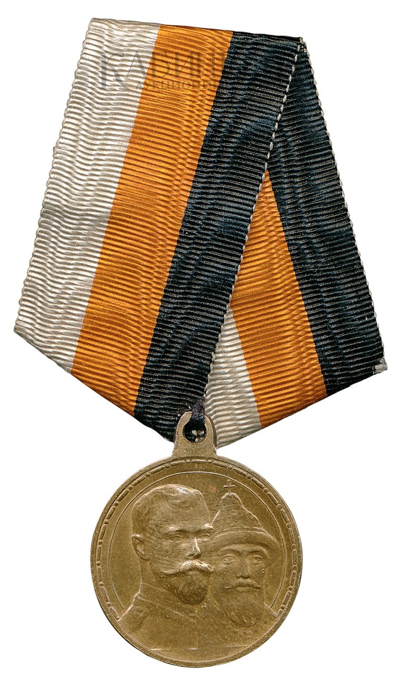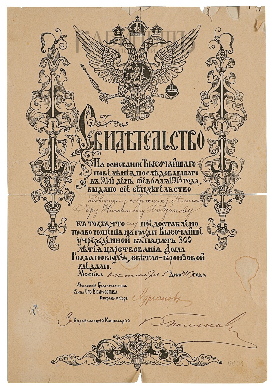 Лот из двух предметов. Медаль «В память 300-летия царствования дома Романовых» на ленте. Свидетельство о предоставлении права ношения медали «В память 300-летия царствования дома Романовых», выданная надворному советнику Александру Николаевичу Богданову. (1.-2.)