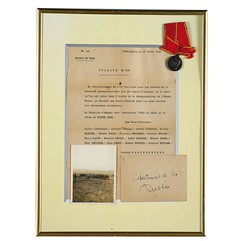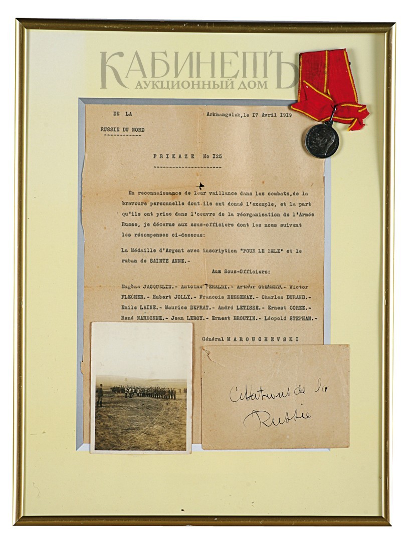 Лот из трех предметов. Медаль «За усердие» с портретом Императора Николая II на колодке с лентой ордена Святой Анны. Приказ о награждении группы унтер-офицеров французского экспедиционного корпуса в Архангельске за подписью командующего войсками Северной области генерала В.В.Марушевского. Фотография церемонии награждения французских солдат.
