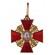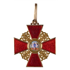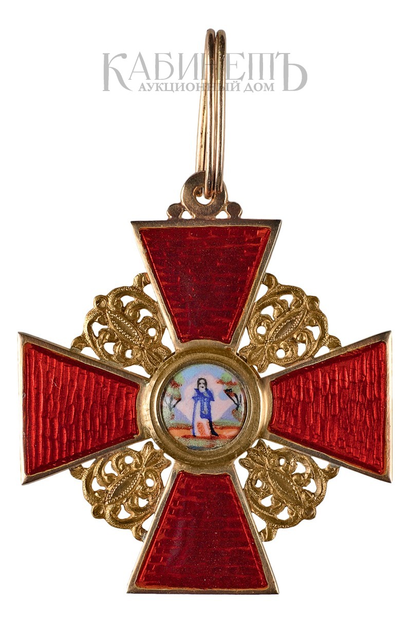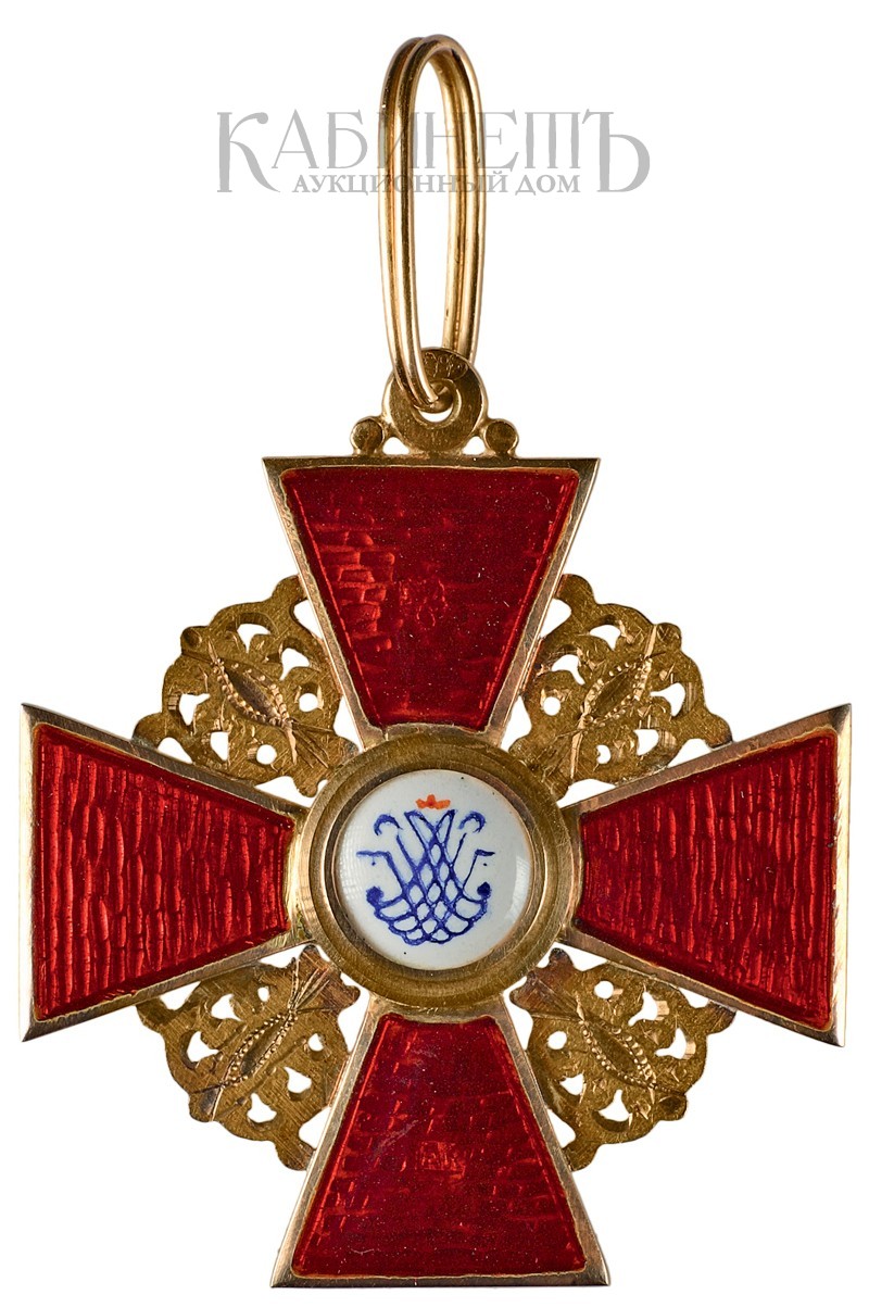Клейма: на оборотной стороне на ушке – пробирное Санкт-Петербургского окружно- го пробирного управления «56» с женской головкой, повернутой влево, и с инициалами управляющего пробирным округом «ЯЛ» (Якова Ляпунова); на оборотной стороне на верхнем луче – императорский орел (знак поставщика Кабинета Е. И. В. и Капитула Императорских и Царских орденов), на нижнем – именник «АК». Состояние превосходное.