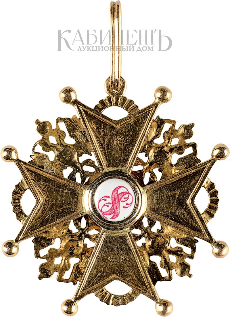 Клейма: на оборотной стороне на ушке — пробирное Санкт-Петербургской пробирной палаты «56» с женской головкой в кокошнике, повернутой влево, с инициалами пробирного инспектора «АР»; на верхнем луче именник «ИЛ», на нижнем луче — развернутое клеймо «Эдуардъ».