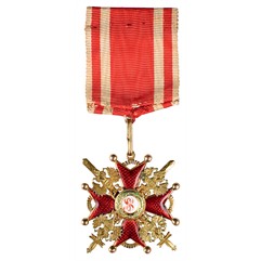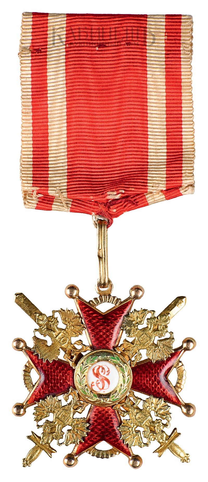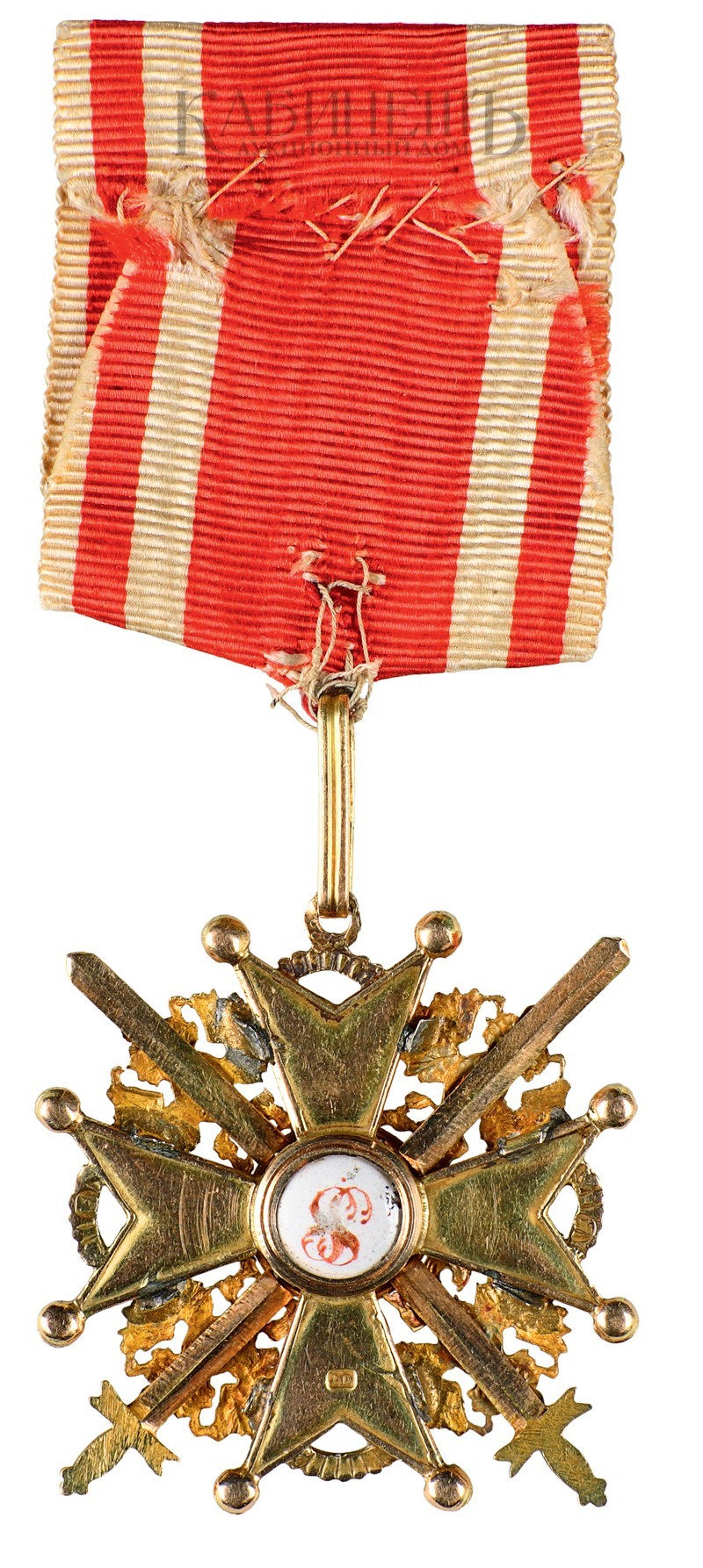 Клейма: на оборотной стороне на ушке – пробирное Петроградского окружного пробирного управления «56»; на нижнем луче именник «ДО»; на дужках горизонтальных лучей, на подвес- ном кольце, на остриях мечей – знаки удостоверения.