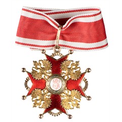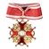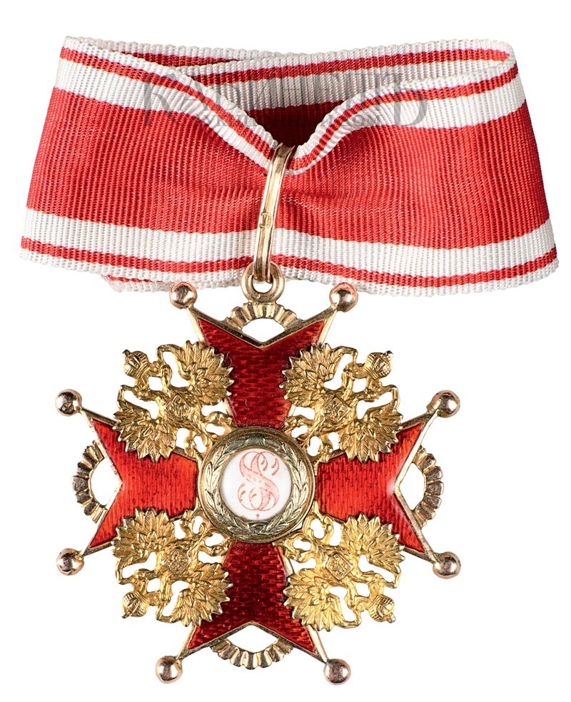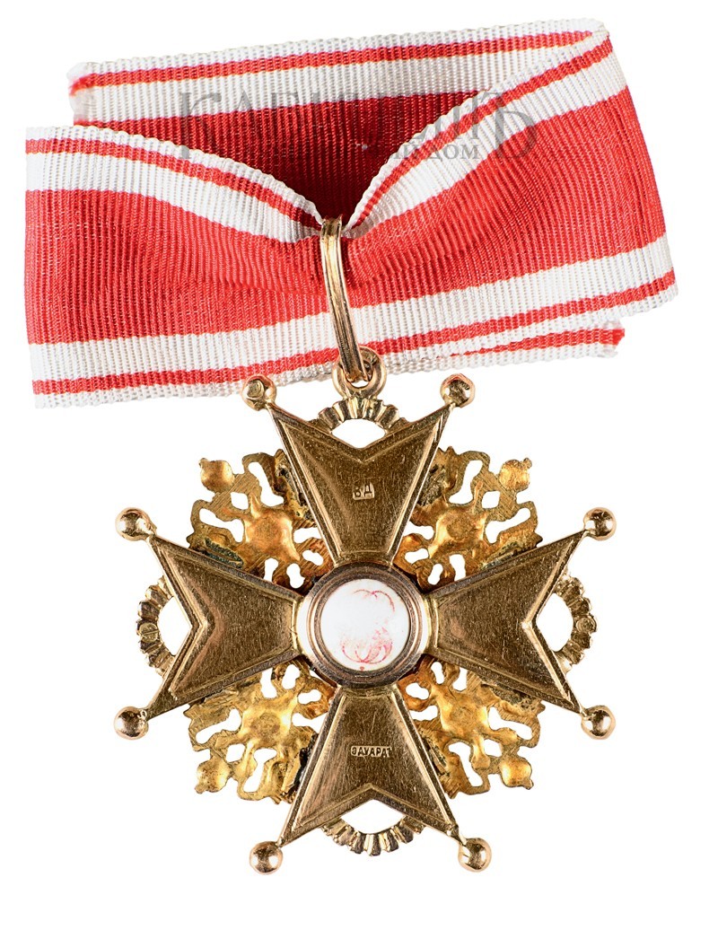 Клейма: на обратной стороне на ушке – пробирное «56» с женской головкой, повернутой вправо; на верхнем луче именник «ВД», на нижнем луче – развернутое клеймо «Эдуардъ», на кончике луча – знак удостоверения; на подвесном кольце— знак удостоверения. На обороте по эмали потертости.