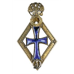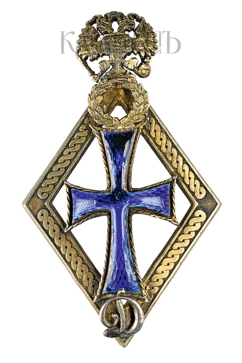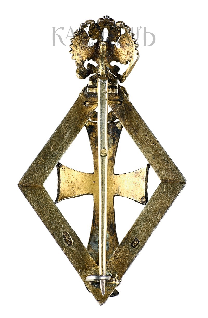 Клейма: на оборотной стороне ромба - пробирное «84» с женской головкой в кокошнике, повернутой влево; инициалы пробирного инспектора «ЯЛ»; именник «АБ», на заколке - знак удостоверения.