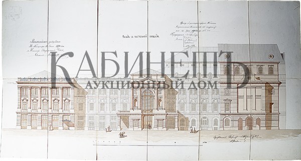 Надпись орешковыми чернилами в левой части эскиза: «Высочайше утверждено в Петергофе 12 июля 1890 года». Подписи Министра Внутренних дел и Статс-секретаря. В правой части: «Фасад сей рассмотрен и одобрен Технически-строительным комитетом по журналу от 28 июня 1890 года № 236». Подписи Председателя и членов комиссии.
