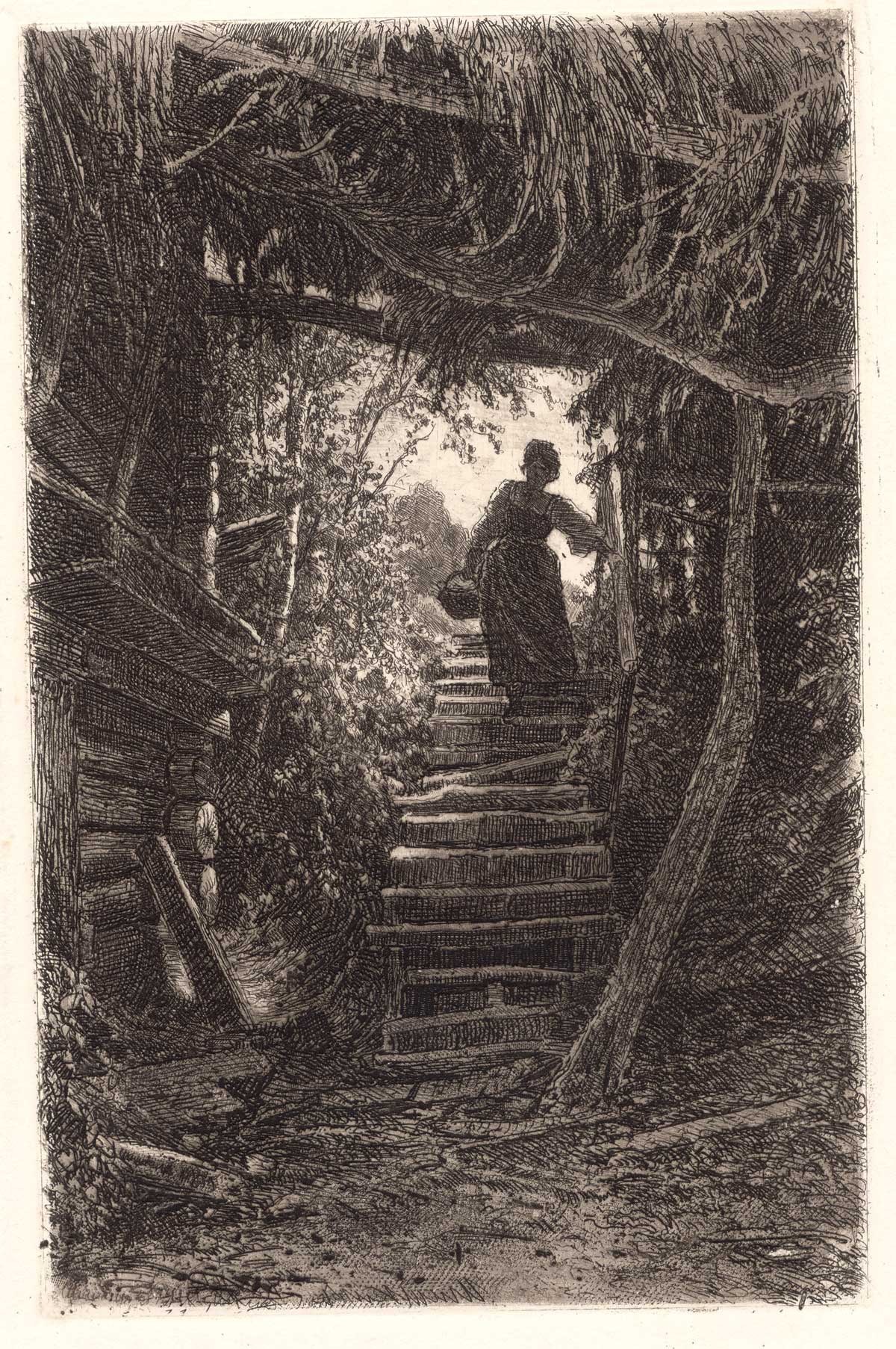 Офорт вошел в альбом «60 офортов И.И.Шишкина», изданный Товариществом А.Ф.Маркса (СПб., 1894), под названием «Крестьянка, сходящая с лестницы».