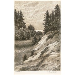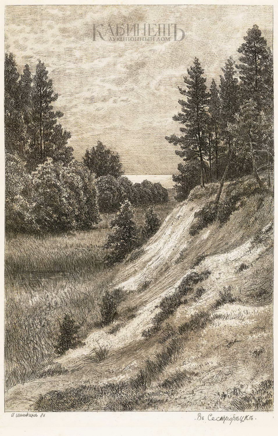 Слева внизу под изображением выгравирована подпись и дата: «И.Шишкинъ 86», справа – название: «Въ Сестрорецкъ». На обороте справа внизу тушью пером подпись и дата «Т.Зутковский./1950». Вдоль нижнего края листа надпись: « № 32. Собственность А.Ф. Маркса. Печат. въ Артист. зав. А.Ф. Маркса въ СПБ».