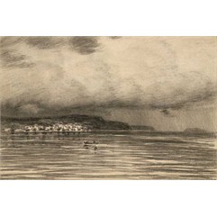 Работа является эскизом для картины 1890 г. «Притихло» (Х., м.; 86 х 143 см. Из собрания ГТГ).