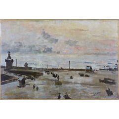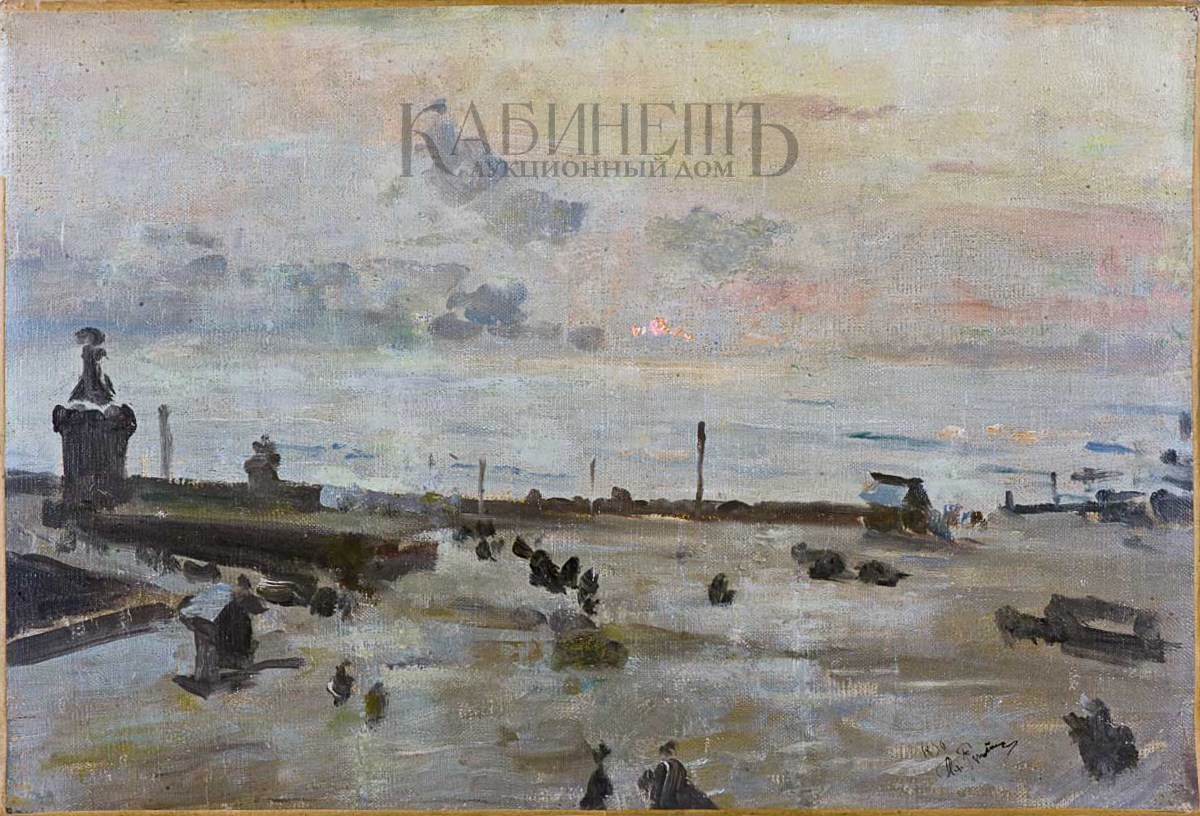 На этюде изображена площадь перед Николаевским (Благовещенским) мостом зимой, на закате морозного дня. Видно оживленное движение саней, груженных льдом, добываемым на Неве. Повидимому, гениального русского живописца привлеки отблески закатного солнца на облаках. Этюд в полной мере отражает творческий метод мастера, базирующийся на реальном зрительном образе и впечатлении – основе импрессионизма, его синтетическом восприятии, непосредственном переживании увиденного и искренности передачи своих впечатлений. Сходное отношение к процессу создания произведений было у французских художников-импрессионистов, в частности у Клода Моне, в полотнах которого видно то же стремление передать изменения цвета воздушных масс и теней, которое мы видим на этюде выдающегося русского художника.