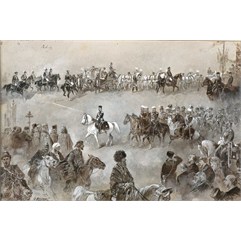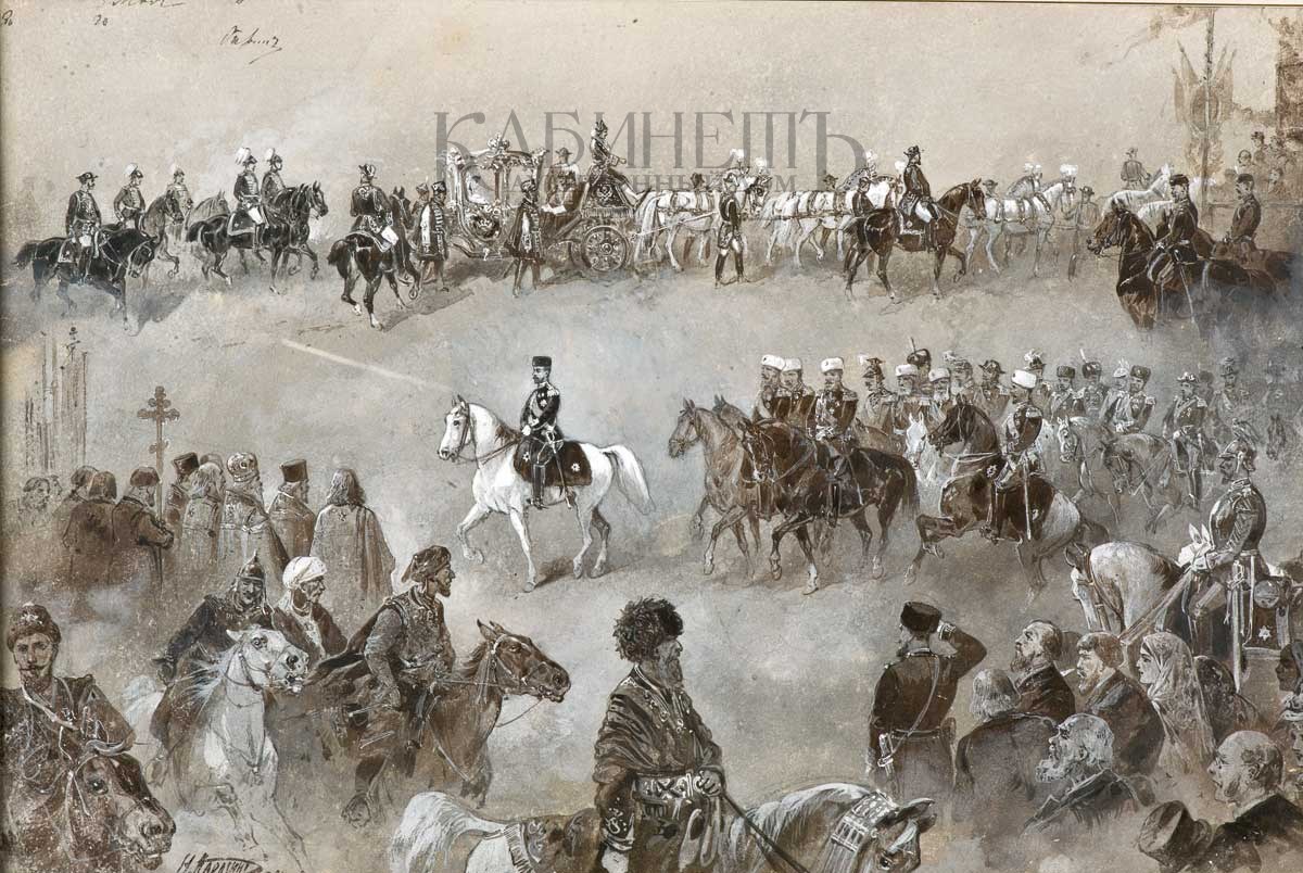 Коронация императора Николая II состоялась в Москве в мае 1896 г. На рисунке изображен эпизод коронационных торжеств, длившихся с 6 по 26 мая 1896 г. Указание художником точной даты позволяет соотнести изображение с торжественным въездом императорской четы в Москву. В соответствии с высочайше утвержденным церемониалом, торжественный въезд совершался от Петровского дворца по Петербургскому шоссе и далее по Тверской-Ямской и Тверской улицам и завершался в Александровском дворце в Кремле. В центре композиции – император Николай II на белом коне въезжающий в Москву, где его встречает духовенство, на дальнем плане изображена карета императрицы Александры Федоровны, проезжающая мимо празднично украшенных трибун. На первом плане показаны толпы зрителей, а также представители различных народностей империи (киргизы, калмыки, узбеки, хивинцы), принимавших участие в торжествах.