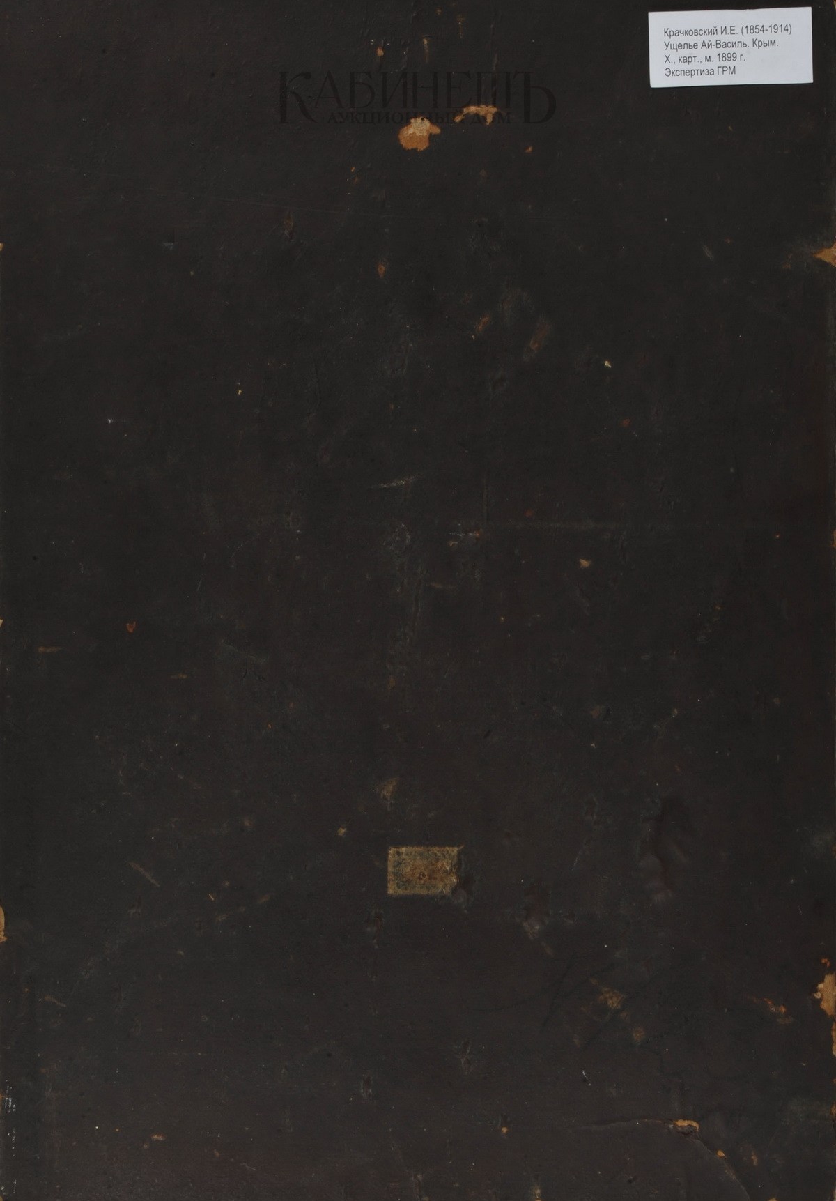 Справа внизу подпись и дата: «J.Крачковскiй/ 1899». На обороте наклейка с посмертной выставки работ художника в Петербурге 1917 г. Справа внизу номер: «№123».