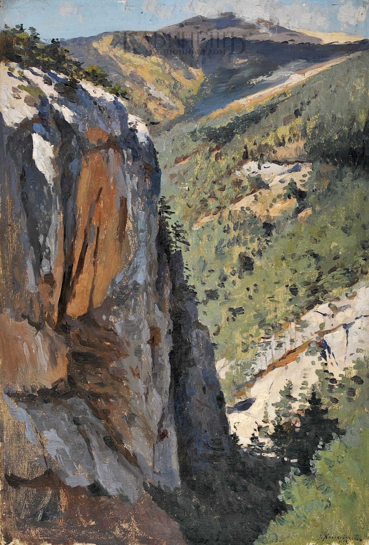 Работа экспонировалась на посмертной персональной выставке художника в Петербурге в 1917 г. и опубликована в каталоге выставки под номером 123 («Ущелье Ай-Василь. Крым»).