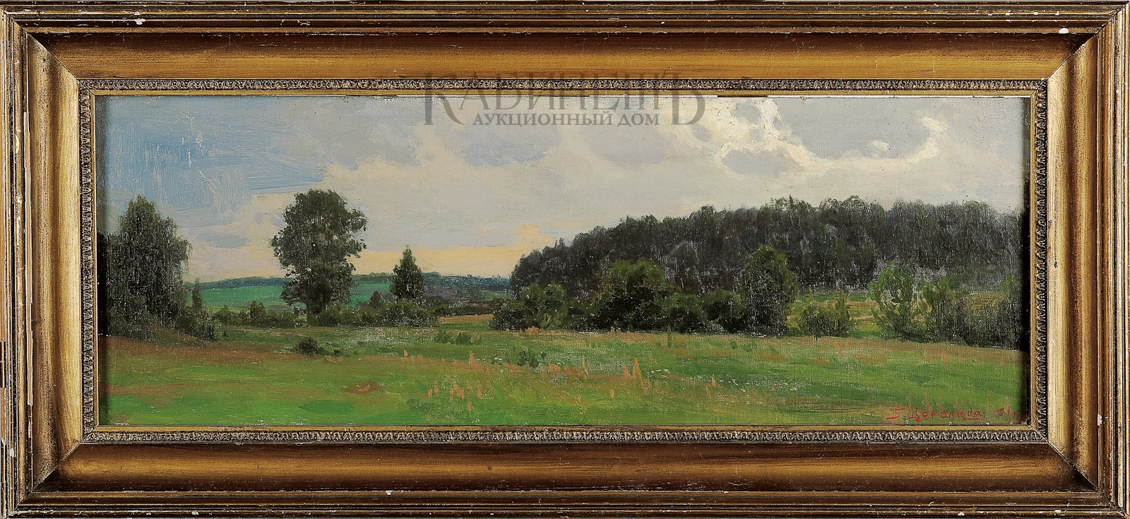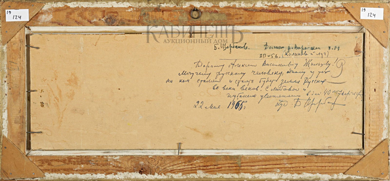 На обороте надпись: «Б.Щербаков. Долина р. Воронки х.м./ 20 х 56 (Калиновый луг)» и дарственная надпись: «Дорогому Алексею Васильевичу Жильцову! / Лучшему русскому человеку, одному из тех/ на ком стояли и стоять будет земля Русская/ во веки веков! С любовью и/ глубоким уважением в день 40-летия творчества/ 22 мая 1965 г. худ. Б. Щербаков».