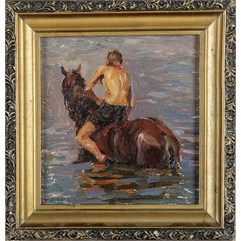 На обороте надписи: «№ 20 1959 г./ 20,6 х 20/ «Купание коня» / Галицкий Р.Н./ к.м.».