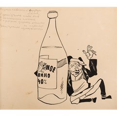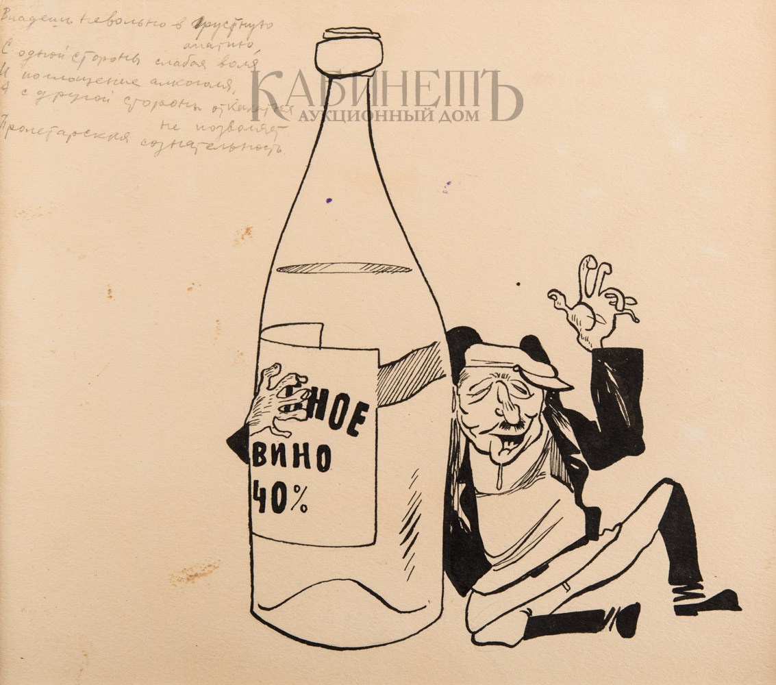 Слева вверху графитным карандашом надпись: «Впадешь невольно в грустную/ апатию,/ С одной стороны слабая воля/ И поглощение алкоголя,/ А с другой стороны отказаться/ не позволяет/ пролетарская сознательность.».