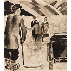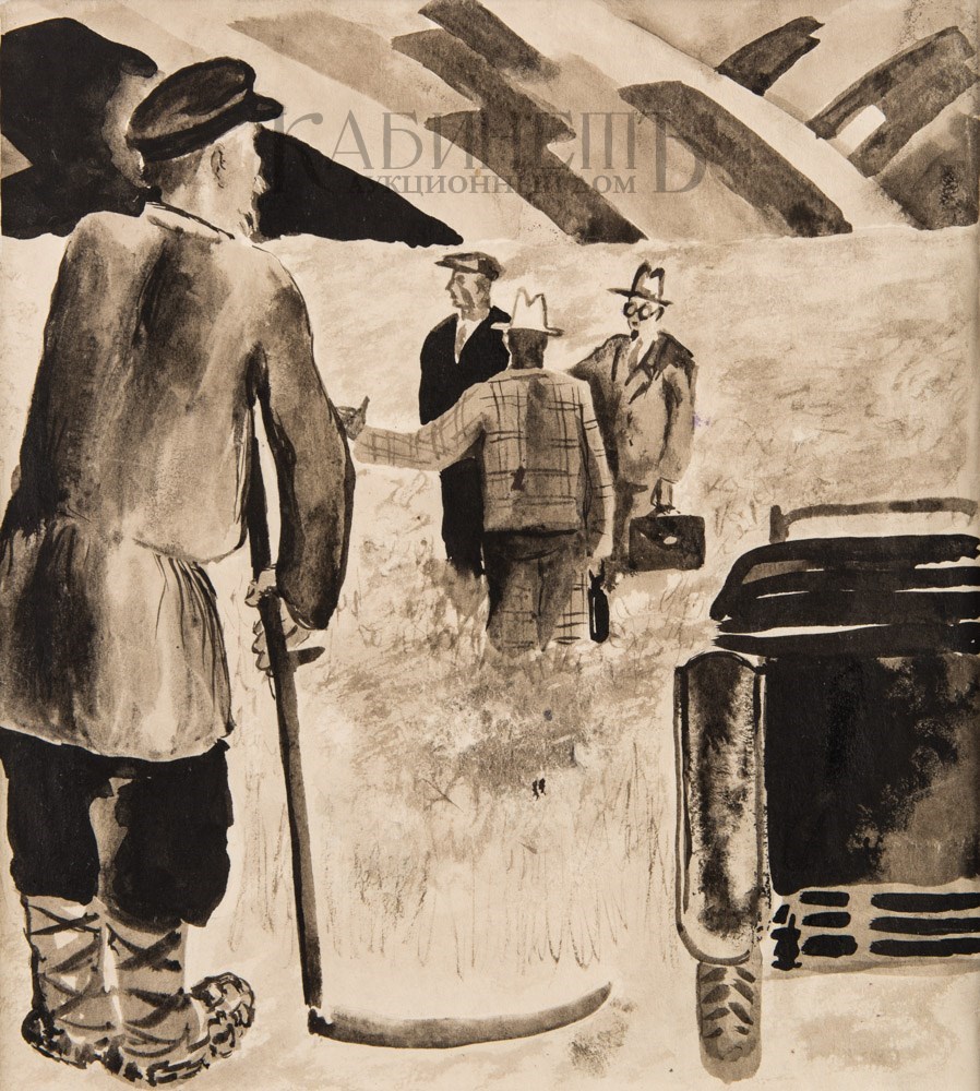 Цейтлин Наум Иосифович (1909–1997) «Из автомобиля вышли люди, говорящие на разных язы ках». Иллюстрация к очерку П. Бычкова «Третья металлургическая».
