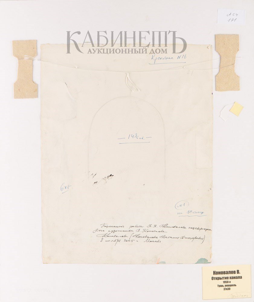 На оборотной стороне типографские пометы и тушью пером подтверждающая подлинность надпись дочери художника: «Подлинность работы В.Я. Коновалова подтверждаю./Дочь художника В. Коновалова/ Коновалова (Коновалова Наталия Викторовна)/ 8 ноября 2005 г. Москва».