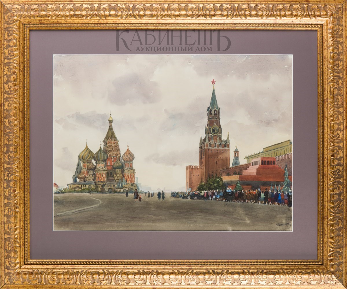 На оборотной стороне слева внизу надпись: «Купецио К.К./ «У мавзолея В.И.Ленина/ акв. 1951 г.».