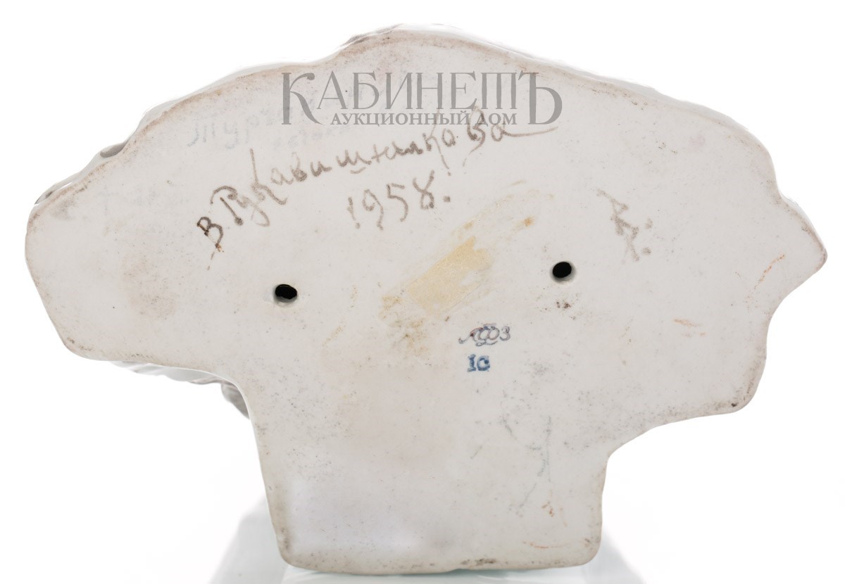 На дне синяя надглазурная марка ЛФЗ, «надпись 1С», подпись-монограмма В.Ф. Руковишниковой, развернутая под- пись «В. Ракавишникова», дата «1958», затертая надпись «Турчанинова/ Евдокия Дмитриевна».