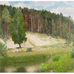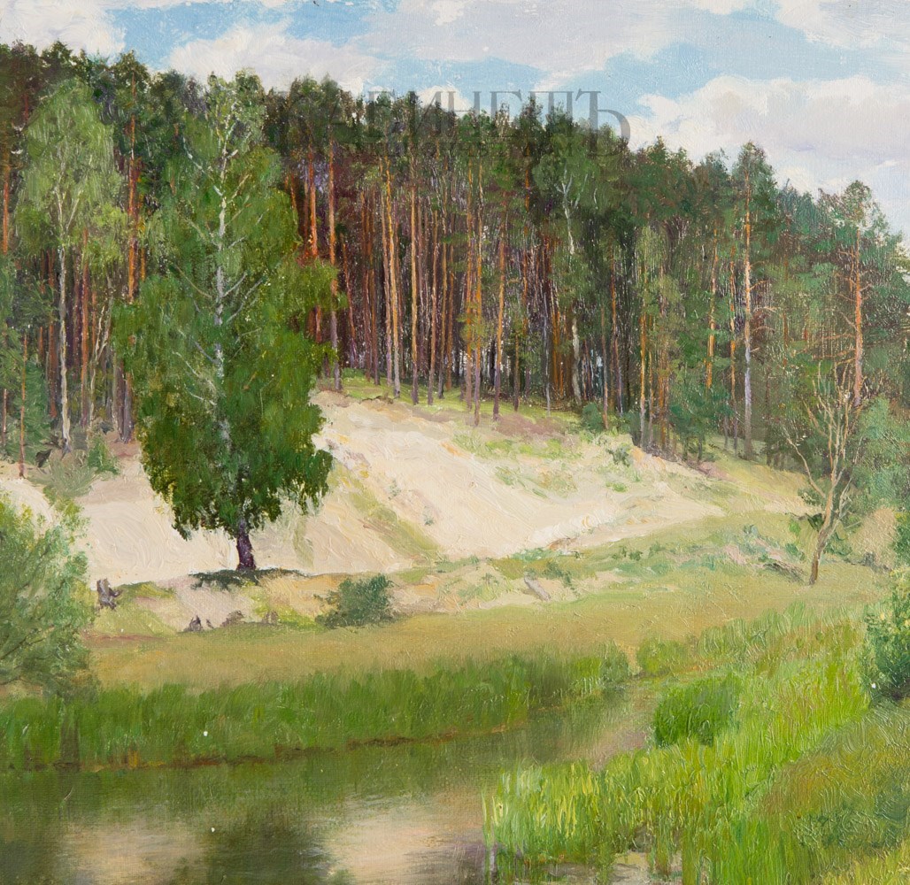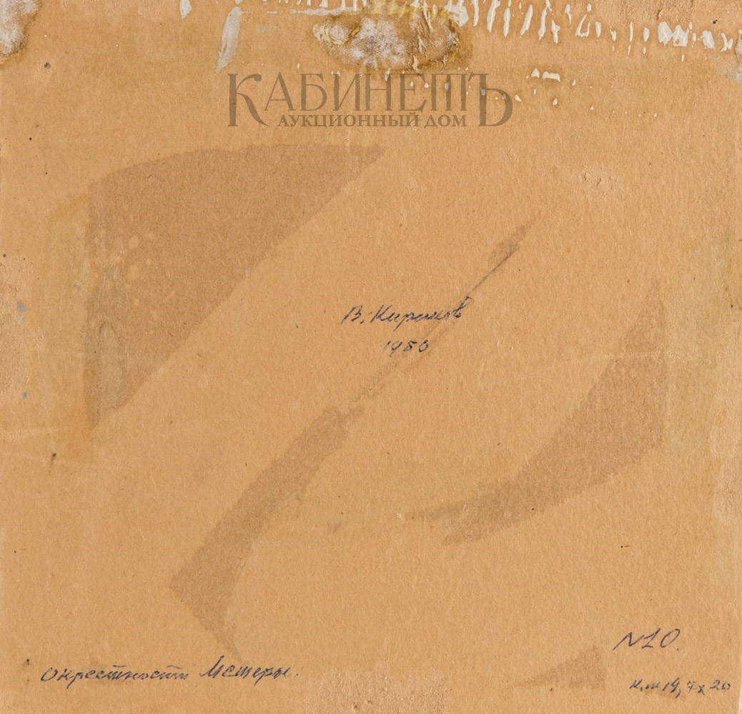 На оборотной стороне шариковой ручкой надписи: «В. Кириков/ 1950/ Окрестности Мстеры./ № 10./ к.м. 19,7 х 20».