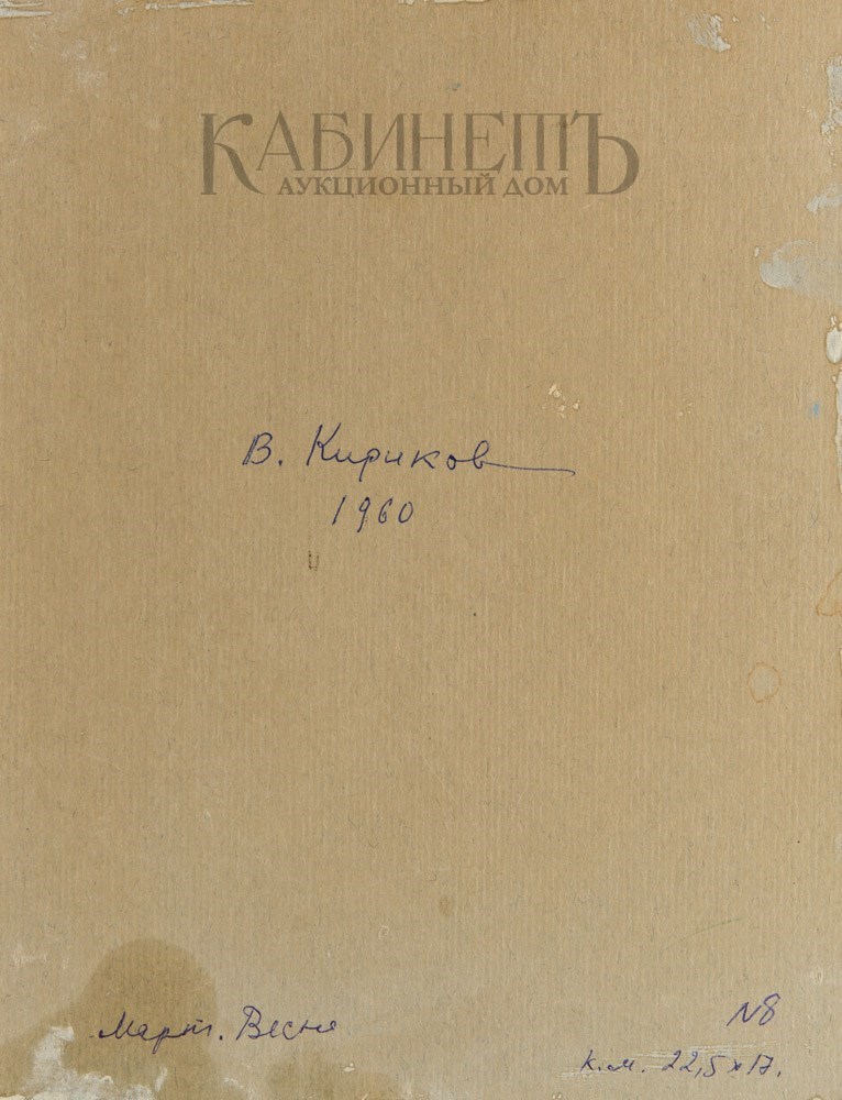 На оборотной стороне шариковой ручкой надпись: «В. Кириков/1960/ Март. Весна. / №8/ к.м. 22,5 х 17.».