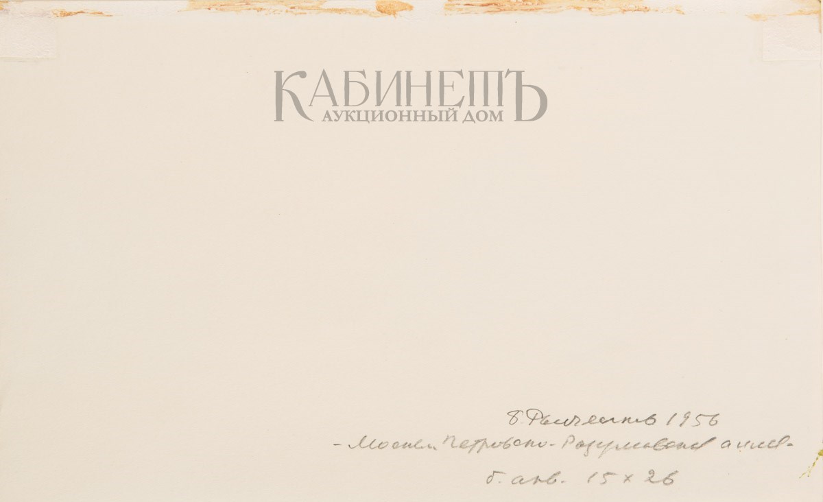 Справа внизу авторские инициалы и дата: «Б.Р. 56». На оборотной стороне справа внизу графитным карандашом надпись: «Б. Рыбченков 1956/ - Москва. Петровско-разумовская аллея-/ б. акв. 15 х 26».