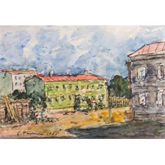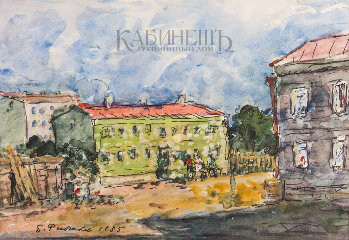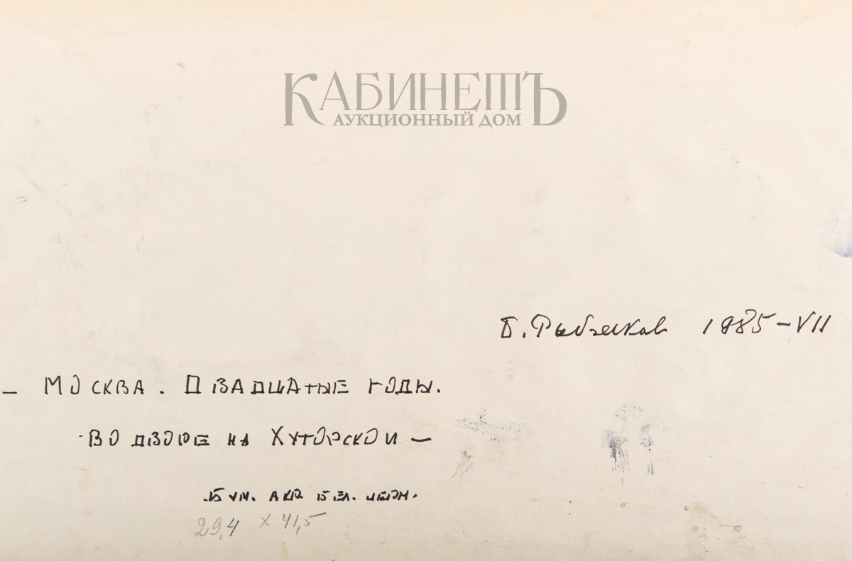 Справа внизу подпись и дата: «Б. Рыбченков 1985». На оборотной стороне в нижней части надпись: «Б. Рыбченков 1985-VII/ - Москва. Двадцатые годы./ Во дворе на Хуторской-/ Бум. акв. бел. черн.».