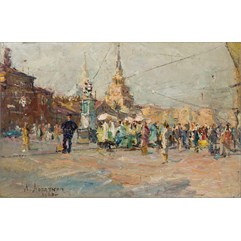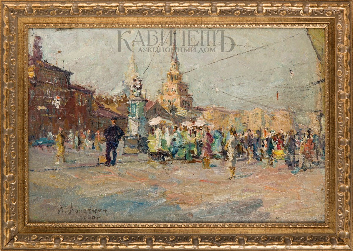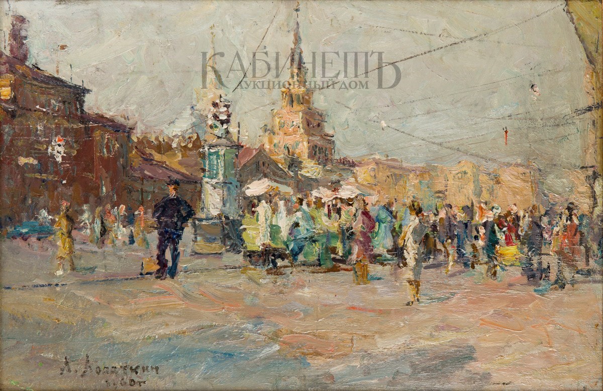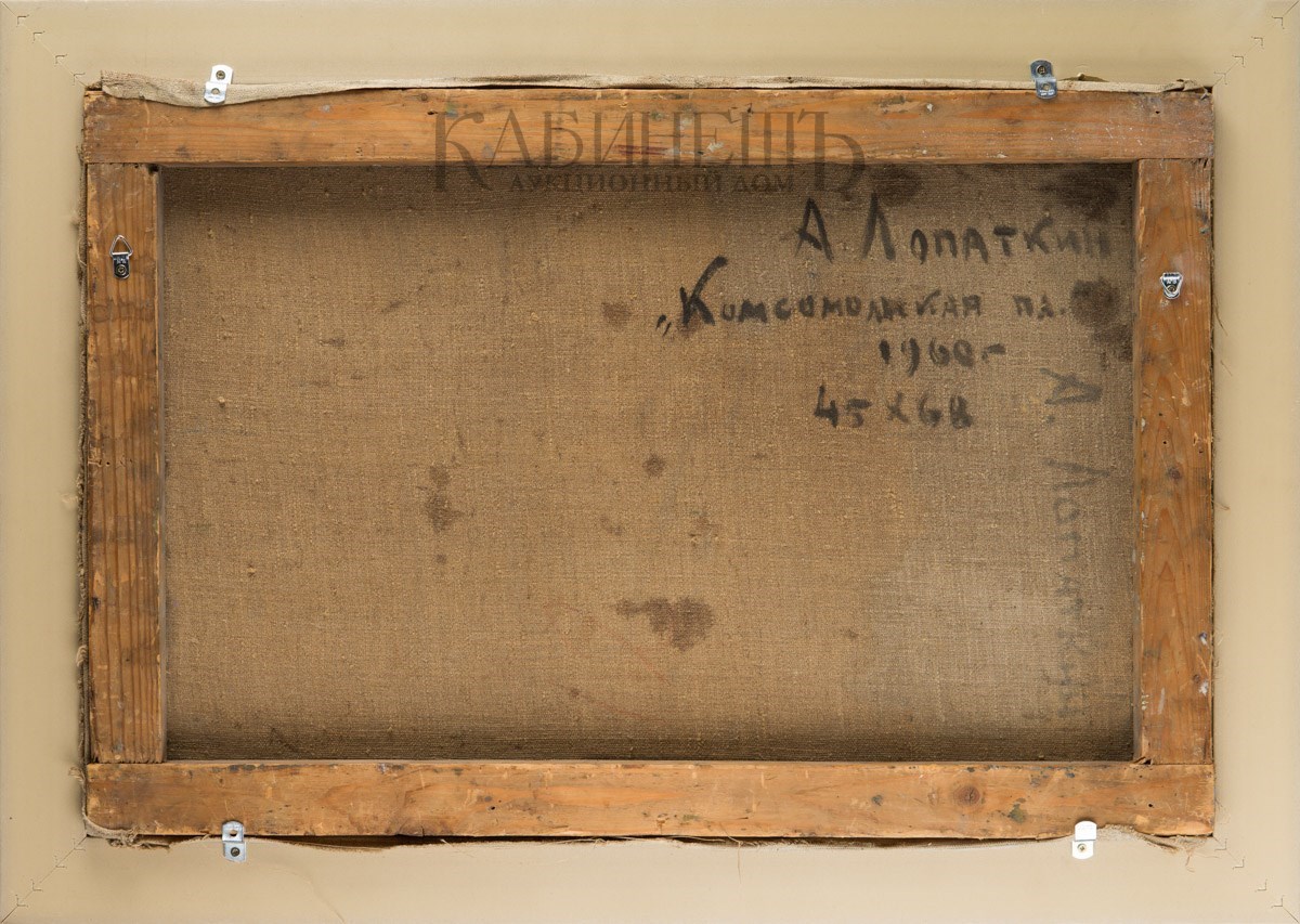 На оборотной стороне справа вверху надпись: «А.Лопаткин/ «Комсомольская пл./ 1960 г./ 45х68».