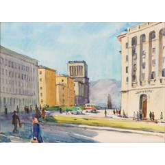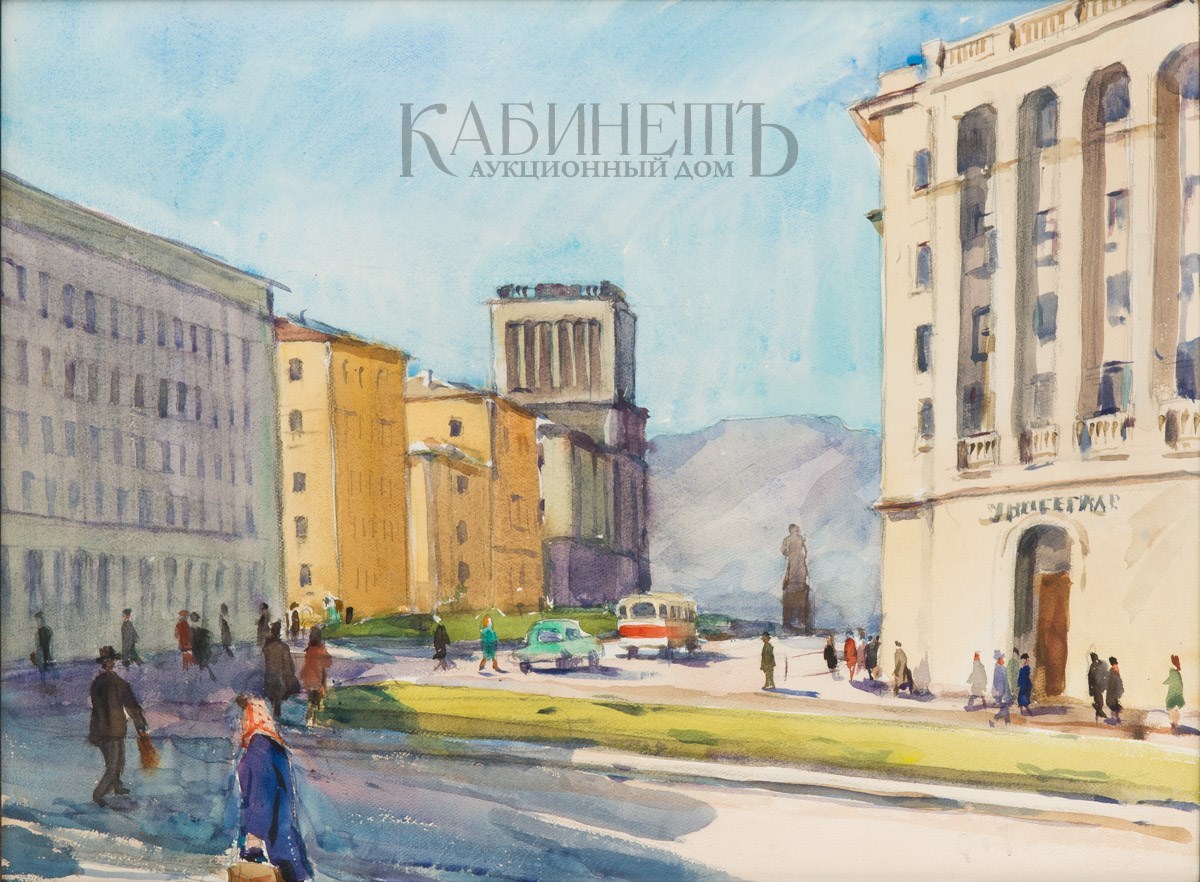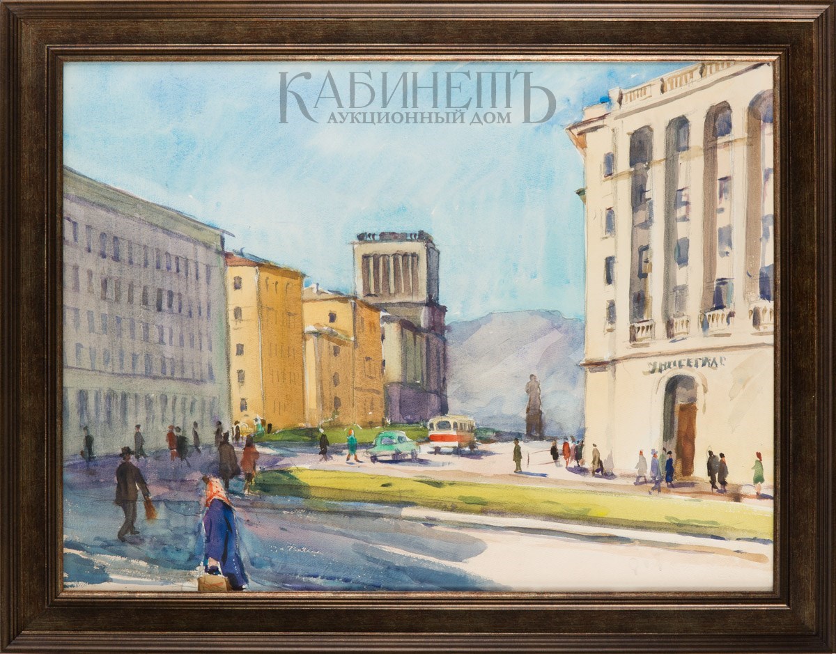 На оборотной стороне слева вверху графитным карандашом надпись: «С. Боим/ В центре Норильска/ 1966 г. акв.».
