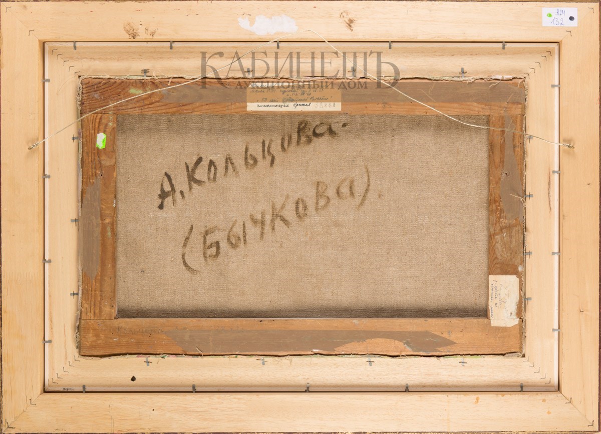 Справа внизу инициалы и дата: «А.К.-Б. 67». На оборотной стороне на подрамнике этикетка и ниже – надпись: «А. Кольцова (Бычкова)».