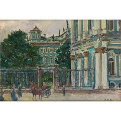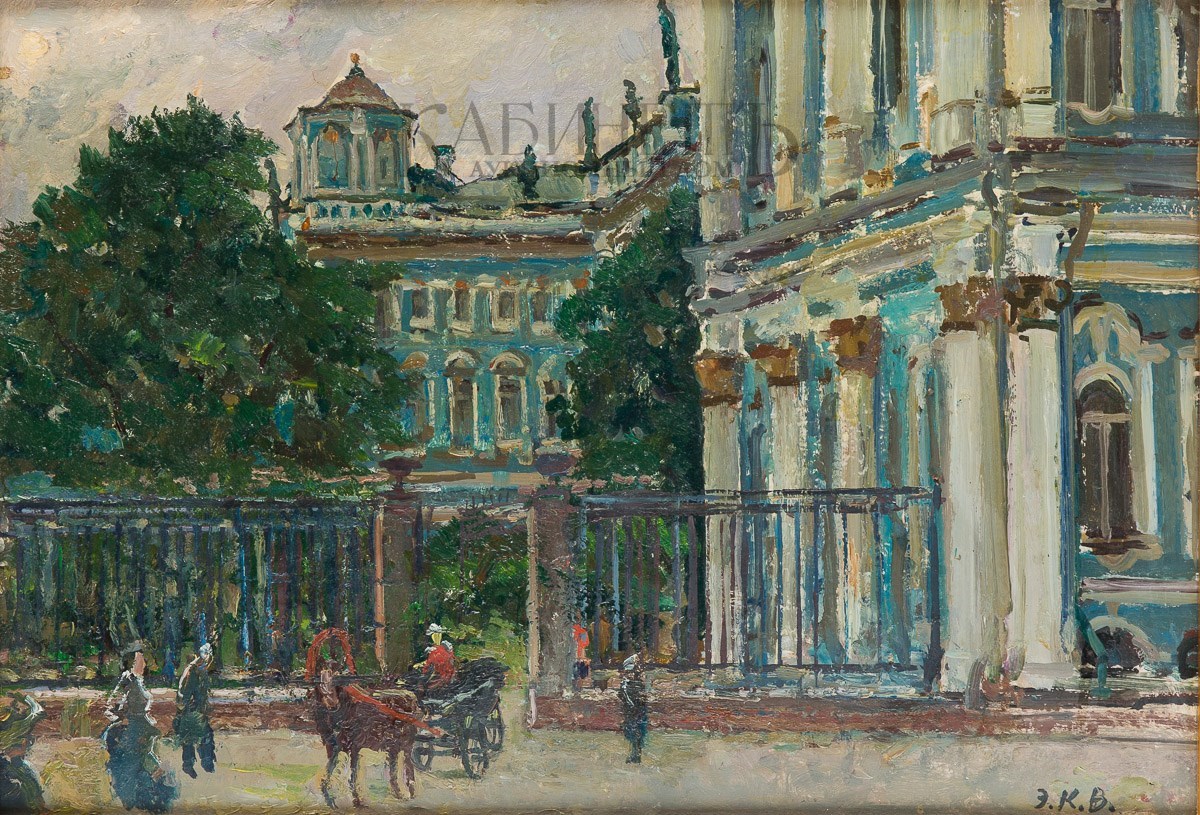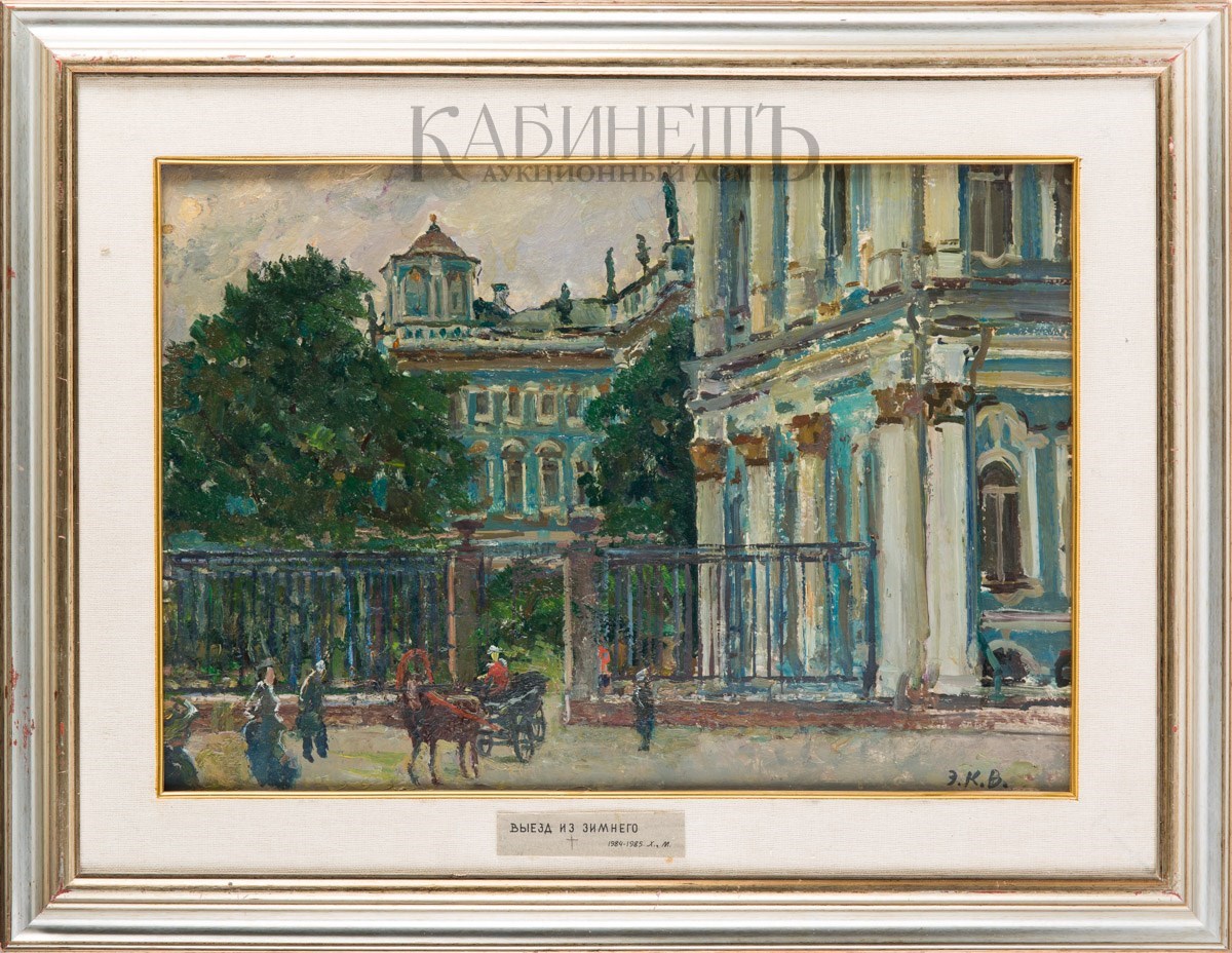 Справа внизу подпись-монограмма: «Э.К.В.» На оборотной стороне название и подпись: «У Зимнего к вечеру»/ Э.К. Вейдеманис» и пометы.