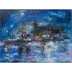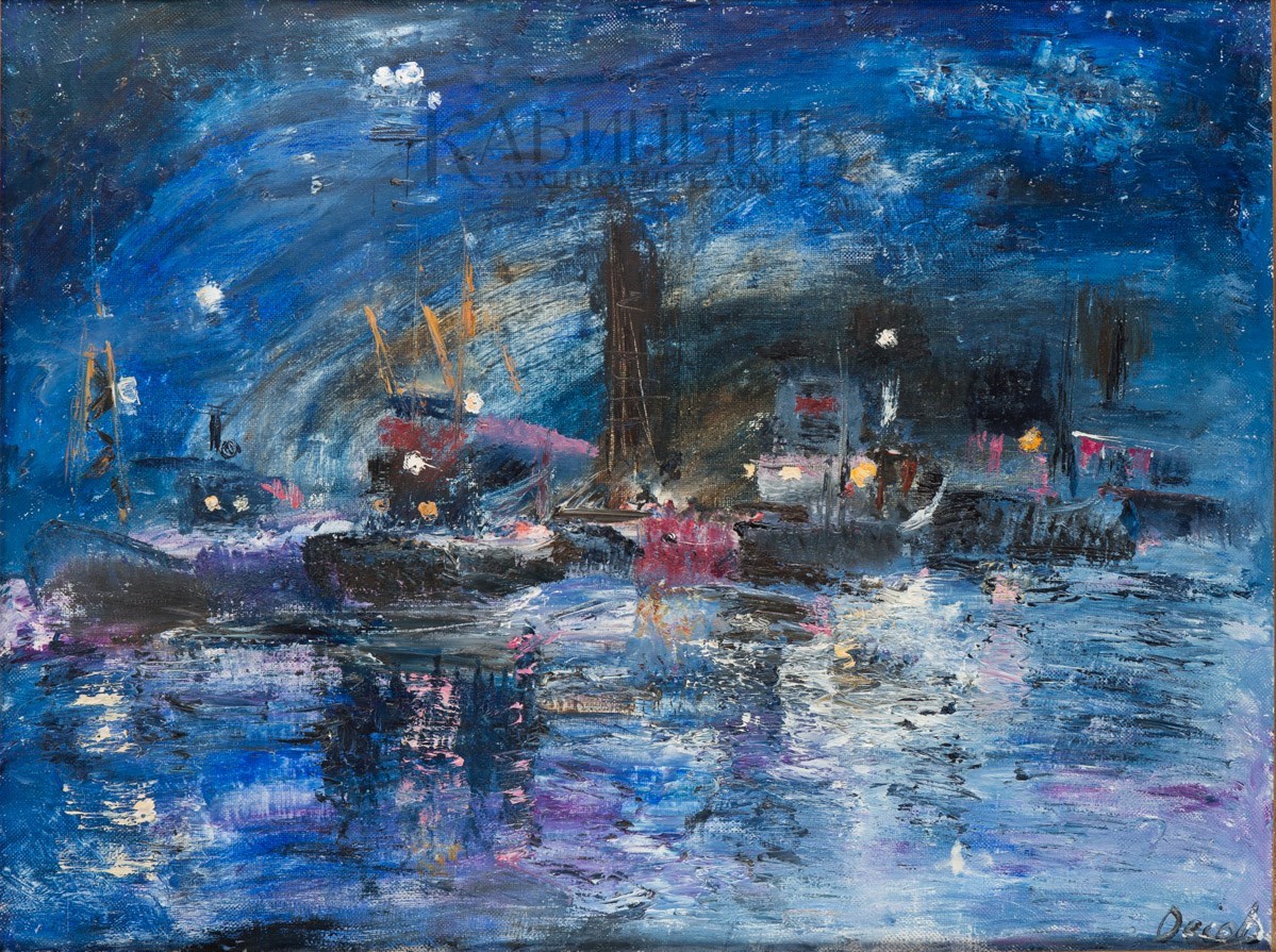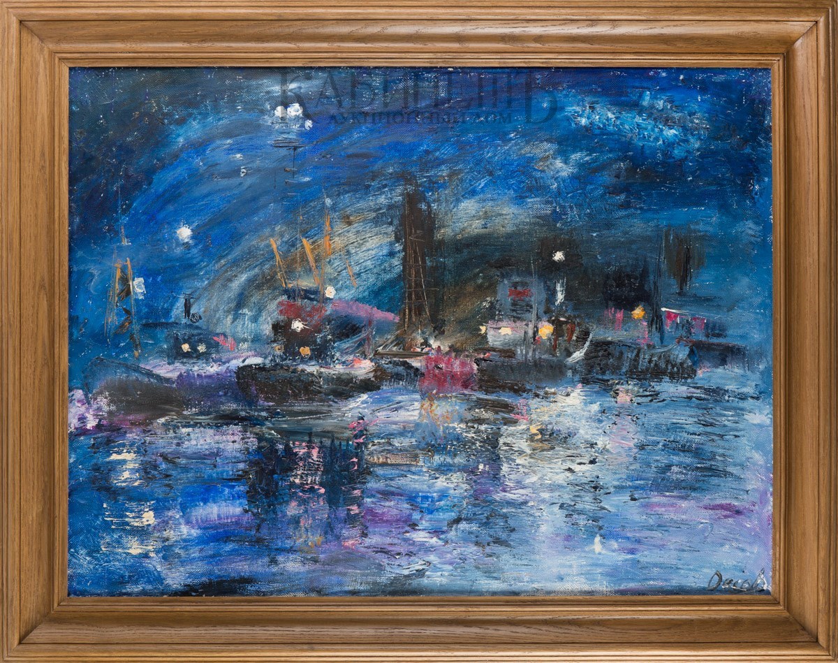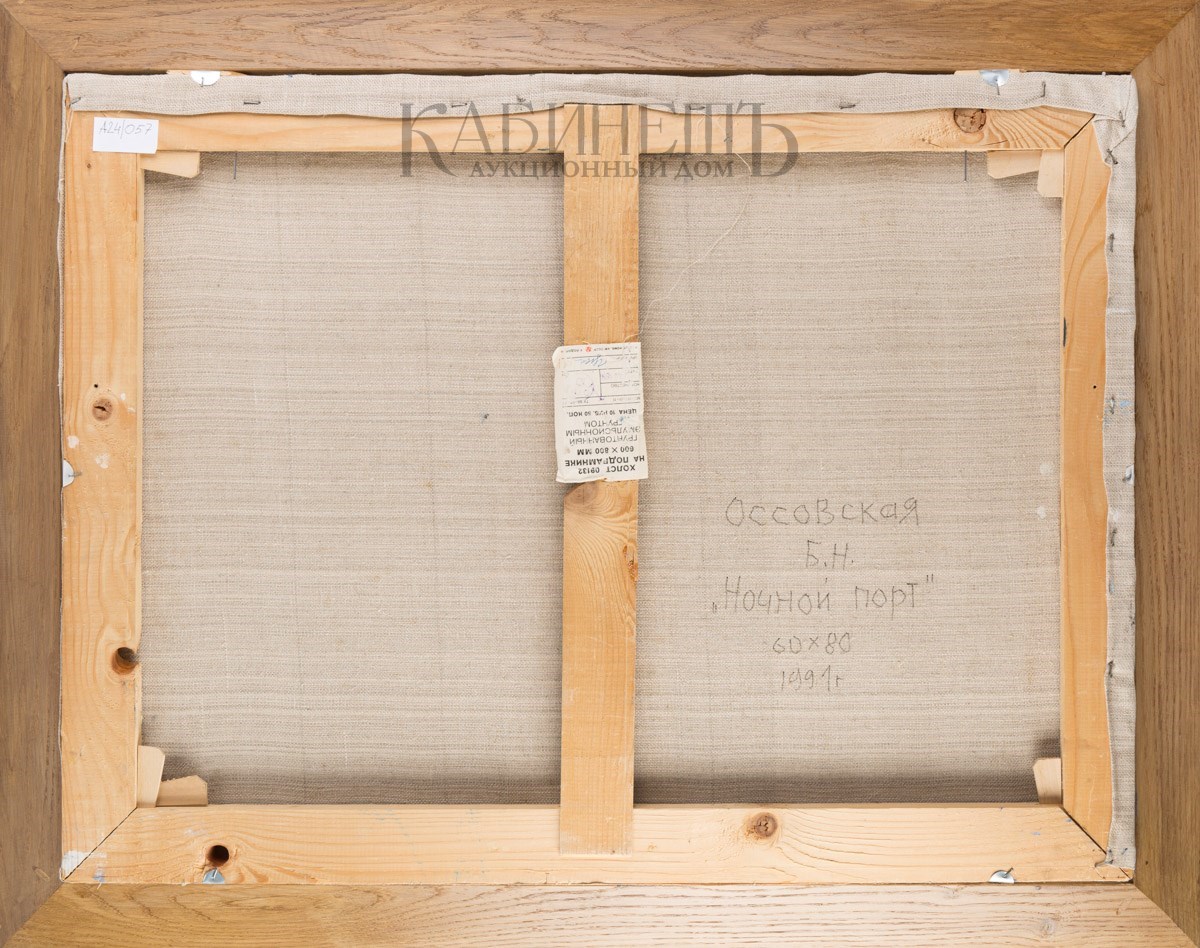 Справа внизу подпись. На оборотной стороне справа внизу надпись: «Оссовская/Б.Н./ «Ночной порт»/60 х 80 /1991 г.»