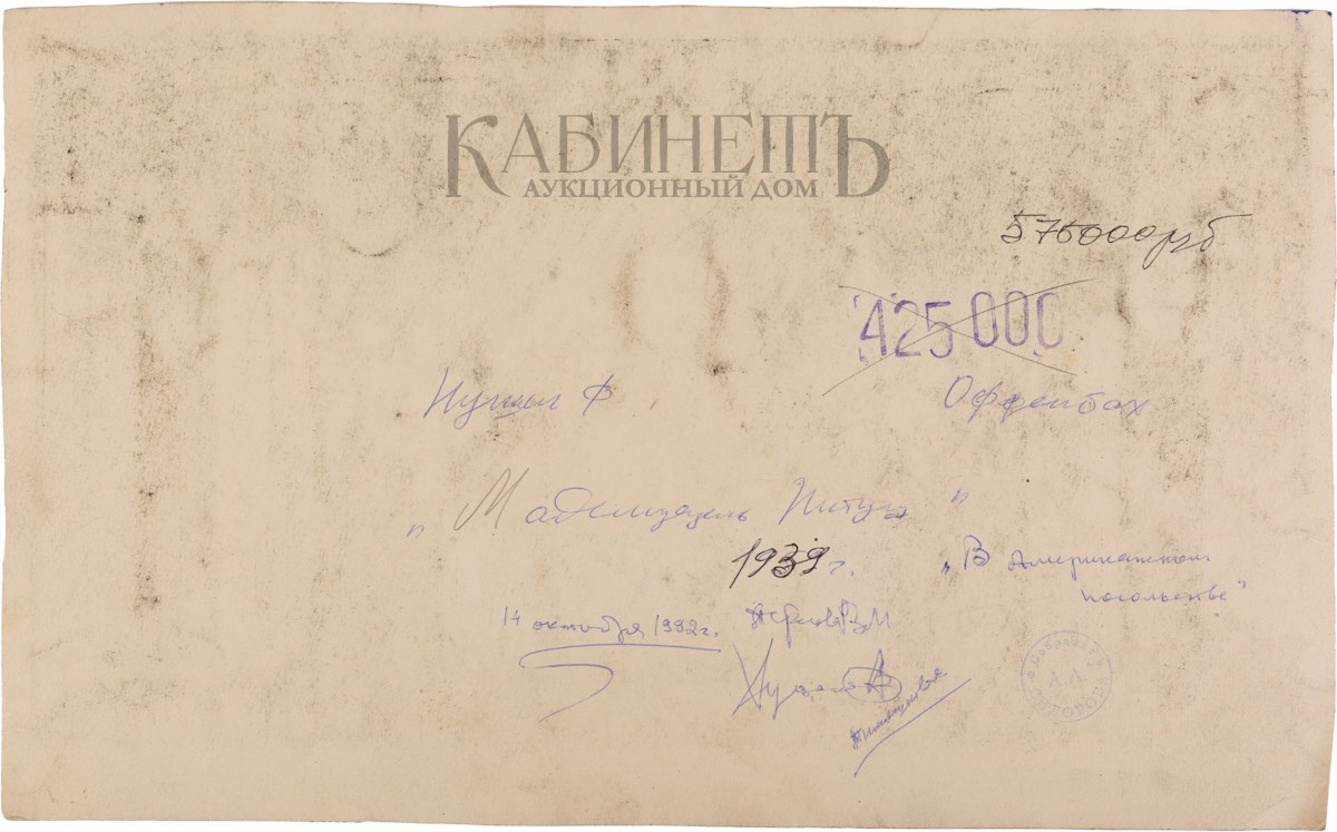 На оборотной стороне пометы и памятная надпись шариковой ручкой: «В американском/ посольстве»/ 14 октября 1992 г.» с автографами, а также оттиск вла- дельческой печати «Собрание/ А.А./ СИДОРОВА».