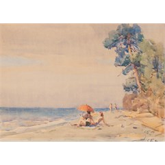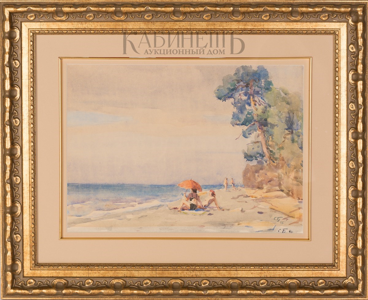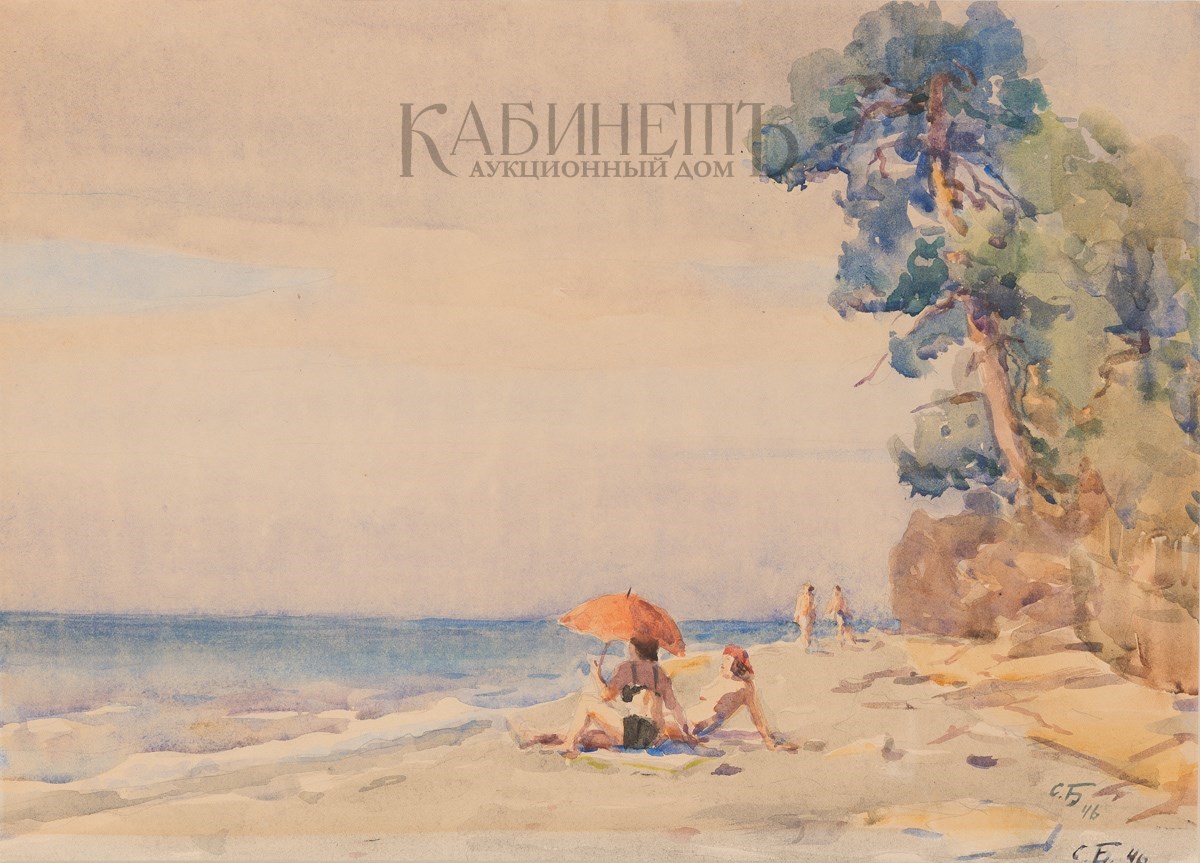 Справа внизу дважды авторские инициалы с указанием даты: «С.Б. 46». На оборотной стороне слева вверху графитным карандашом надпись: «С. Боим/ На пляже. 1946г».