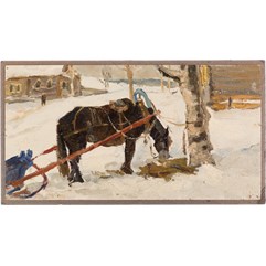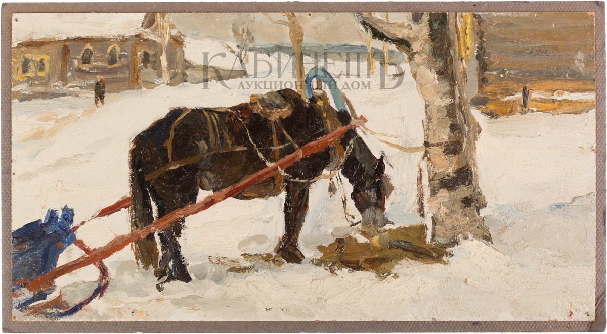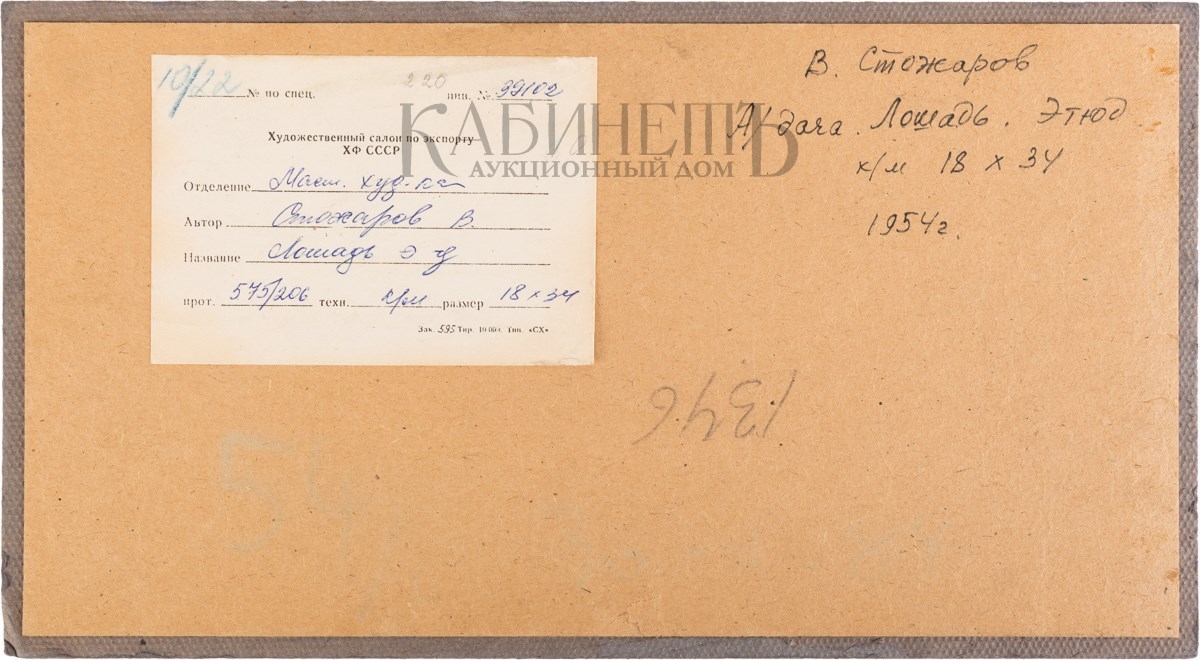 На оборотной стороне слева вверху этикетка Художественного салона по экспорту ХФ СССР с указаниями имени автора, название картины, ее размерам и материалом. Справа вверху надпись: «В. Стожаров/А/ дача. Лошадь. Этюд./ к/ м 18 х 34/ 1954 г.», ниже – номер графитным карандашом: «1346».