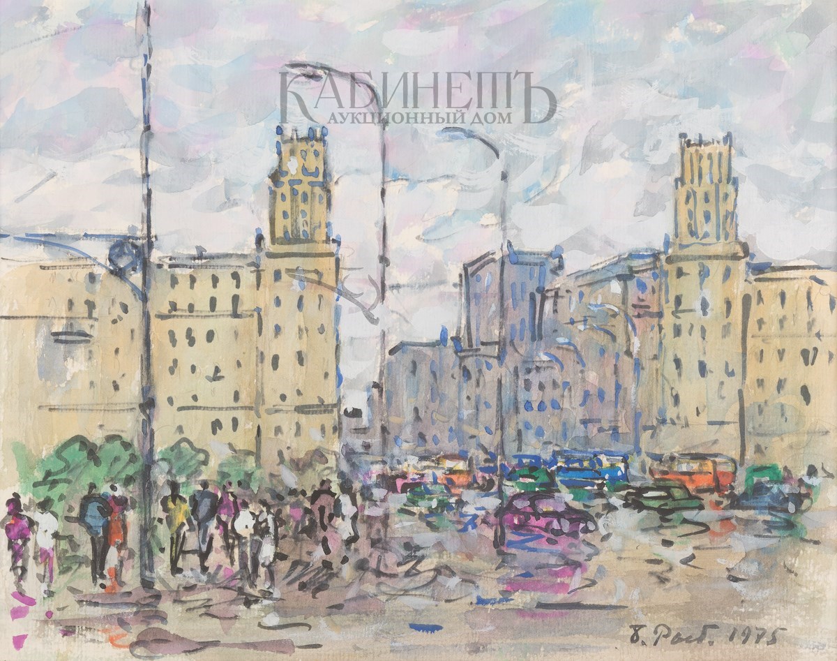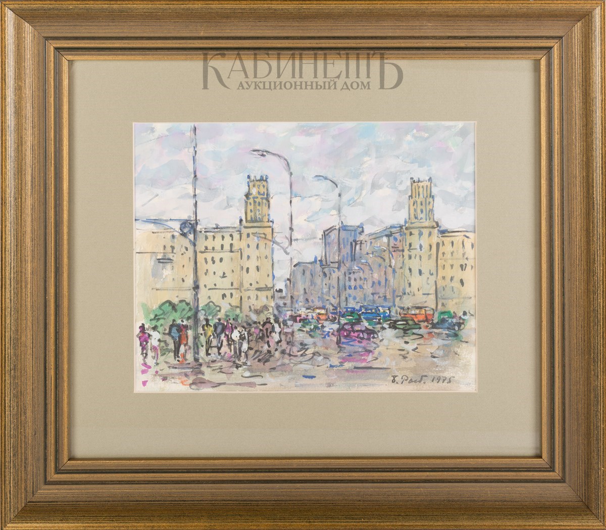 Справа внизу авторская подпись и дата: «Б.Рыб. 1975». На оборотной стороне справа внизу графитным карандашом надписи: «Б. Рыбченков 1975/ – Москва. На площади Гагарина – / бум. гуашь. фломастер-23х28». Оформлена в современную раму с паспарту.
