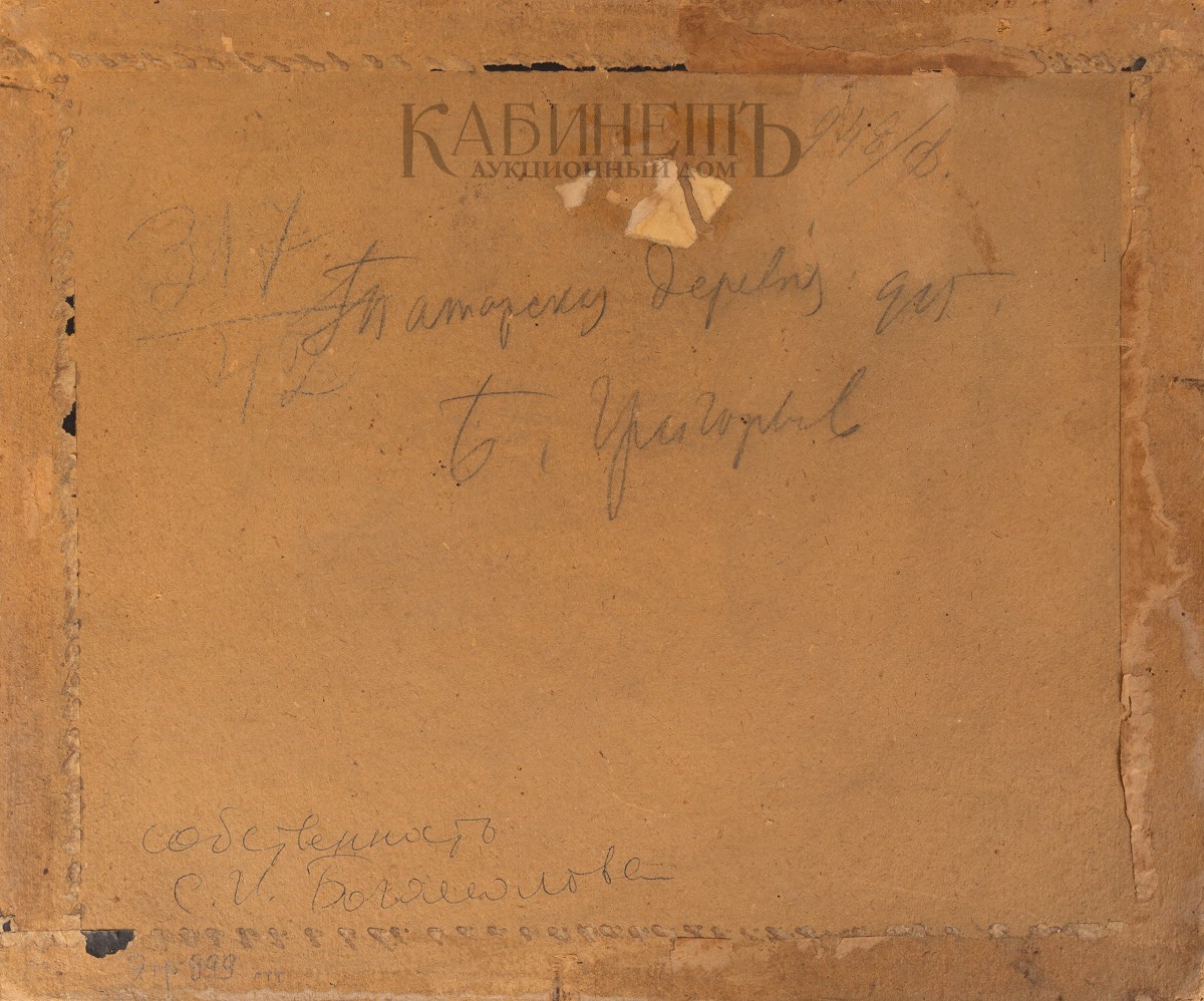 На оборотной стороне авторская надпись с указанием названия композиции, датой и подпись: «Татарская деревня 915 // Б.Григорьев». В нижней части надпись: «Собственность С.И. Богомолова».