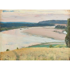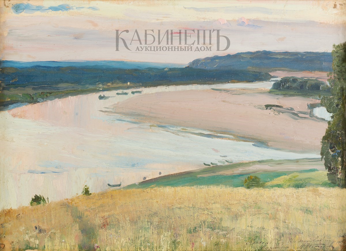 Работа М.В. Нестерова «Излучина реки. Вечер.» является эскизом к картине 1905 года «За Волгой» (Холст, масло 132 х 134 см), находящейся в собрании Астраханской государственной картинной галереи.