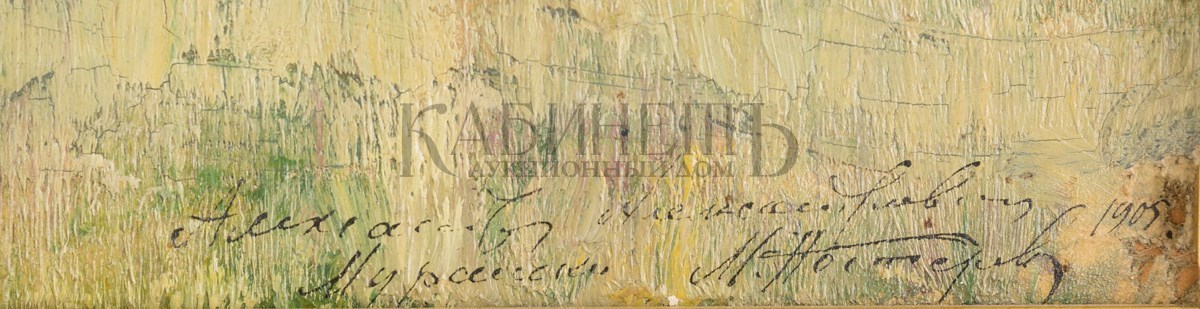 Справа внизу тушью пером авторская дарственная надпись: «Александру Александровичу/ Мурашко М. Нестеровъ/ 1905.».