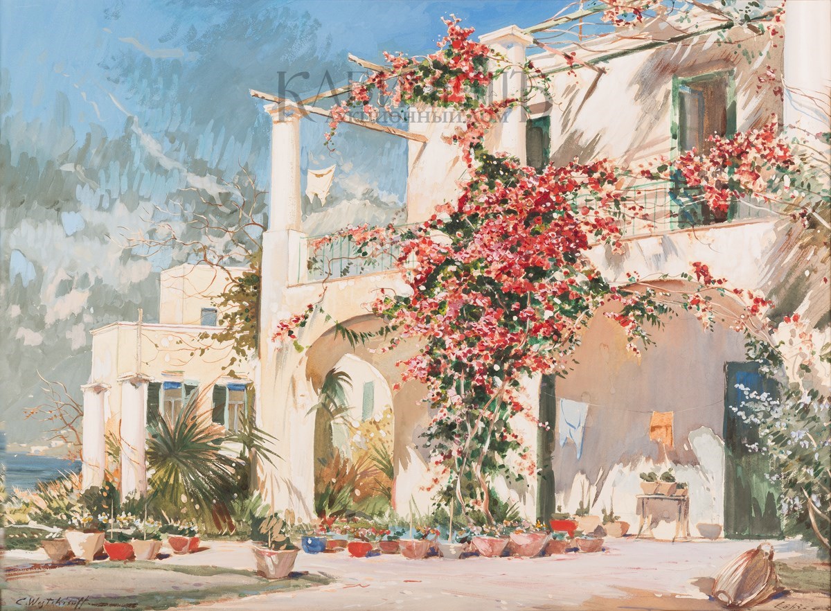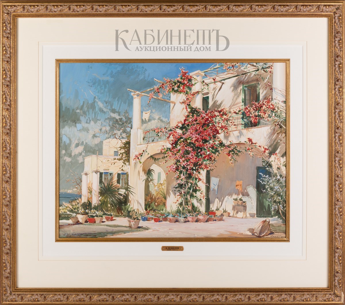 С начала 1910-х гг. К.А. Вещилов регулярно бывал на Капри и экспонировал на разных выставках виды острова. В 1928 г. в Париже в галерее Шарпентье была организована персональная выставка художника, на которой были представлены более сотни работ по итальянским мотивам. Вероятнее всего, представленная на аукционе работа «Капри. Цветы бугенвиллии.» была создана в этот период.