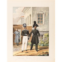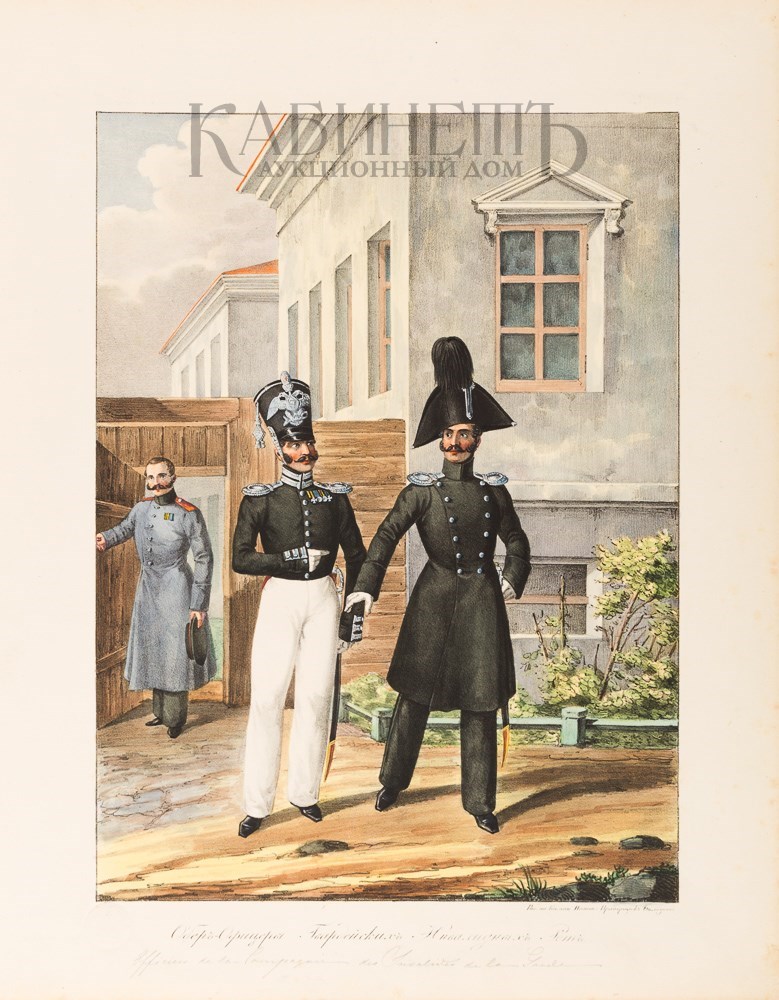 Под изображением справа внизу подпись «Рис на Камнъ Гарнизонъ. Инж. Прапорщикъ Белоусовъ». Под изображением слева продавленный в бумаге штамп, по центру название: «Оберъ-Офицеры Гвардейскихъ Инвалид- ныхъ Ротъ.», ниже графитным карандашом надпись: «Officiers de la Campagnie des Invalides de la Garde». Лист из альбома «Собрание мундиров Российской Императорской Армии» к многотомному изданию А.В. Висковатова «Историческое описание одежды и вооружения Российских войск».