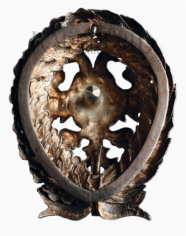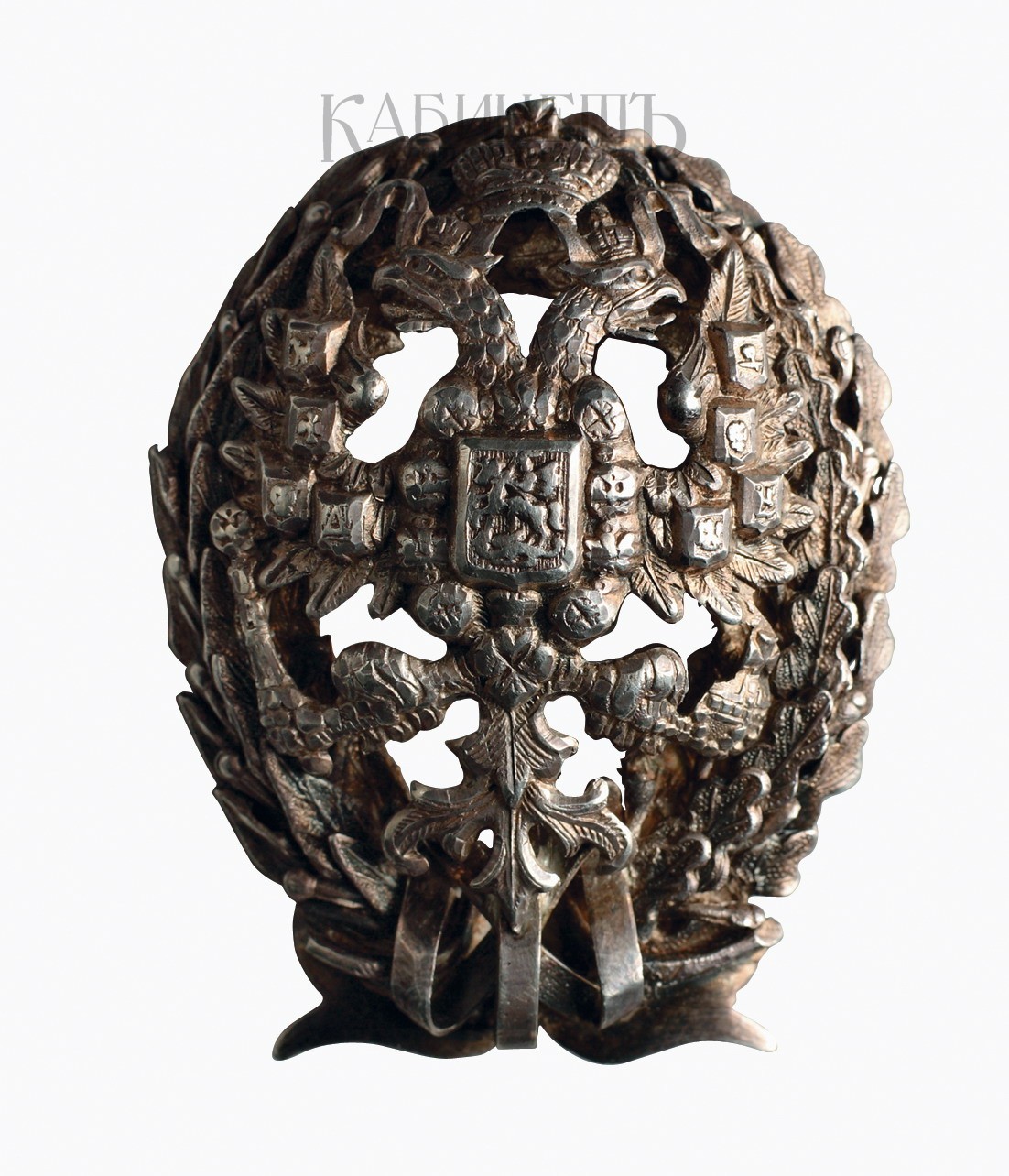 Клейма: на оборотной стороне – 84-й пробы с женской головкой в кокошнике, повернутой вправо, и буквой «дельта», знак удостоверения, именник «БрБ»; на шайбе – знак удостоверения и именник; на гайке – знак удостоверения.